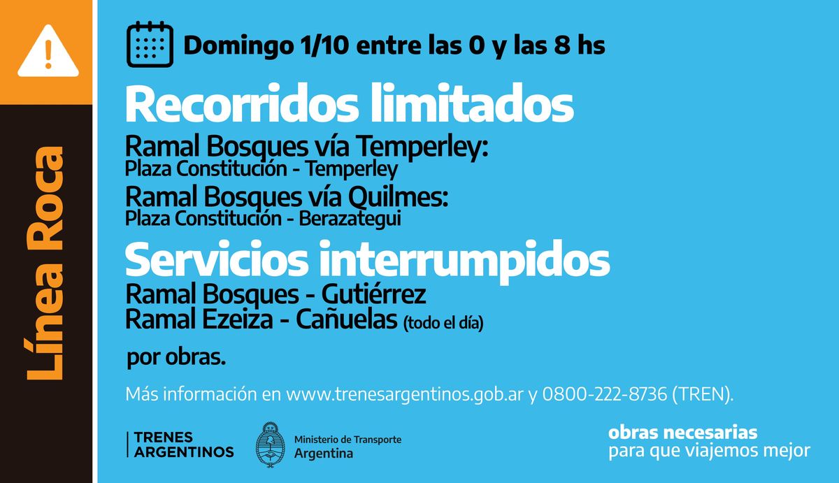 Por otra parte, los ramales a Bosques vía Temperley y vía Quilmes, circularán de forma limitada hasta Temperley y Berazategui respectivamente, entre la medianoche y las 8 de la mañana. Por su parte, el ramal Bosques-Gutiérrez también permanecerá interrumpido hasta esa hora.