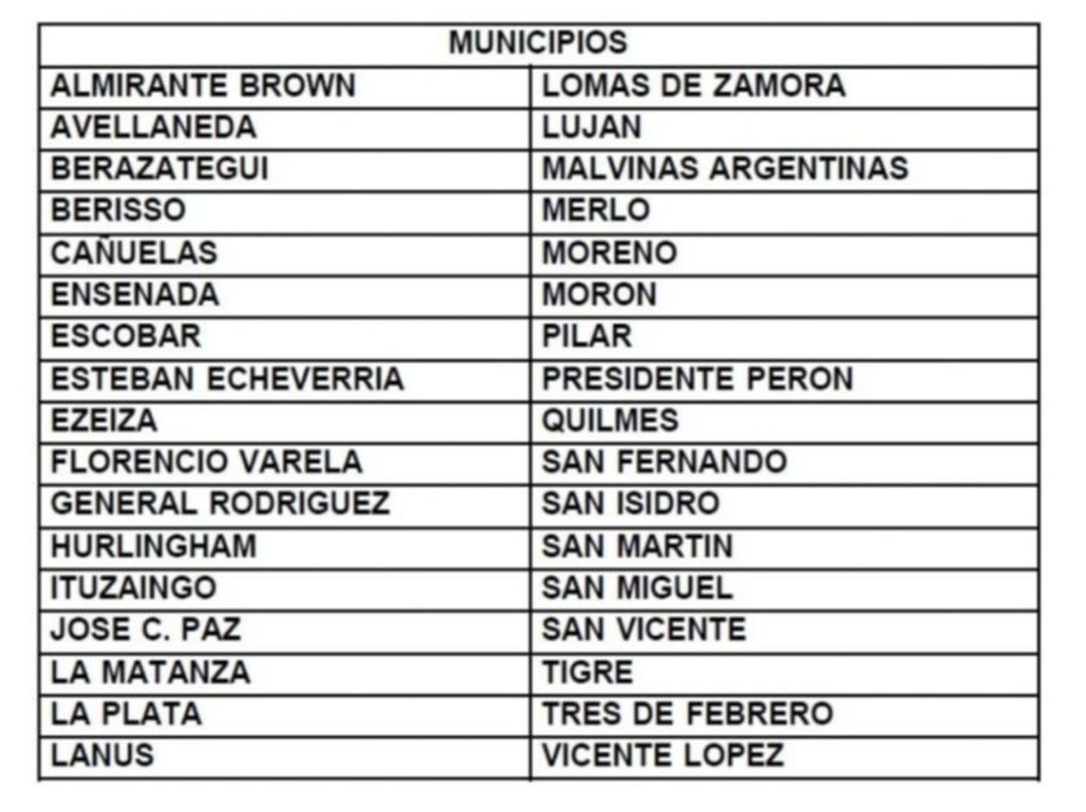 Esta medida rige en 34 partidos diferentes de la Provincia de Buenos Aires, entre los cuales se encuentran Almirante Brown, Avellaneda, Berazategui, Cañuelas, Esteban Echeverría, Ezeiza, Lanús, Lomas de Zamora, Presidente Perón, San Vicente, entre otras.