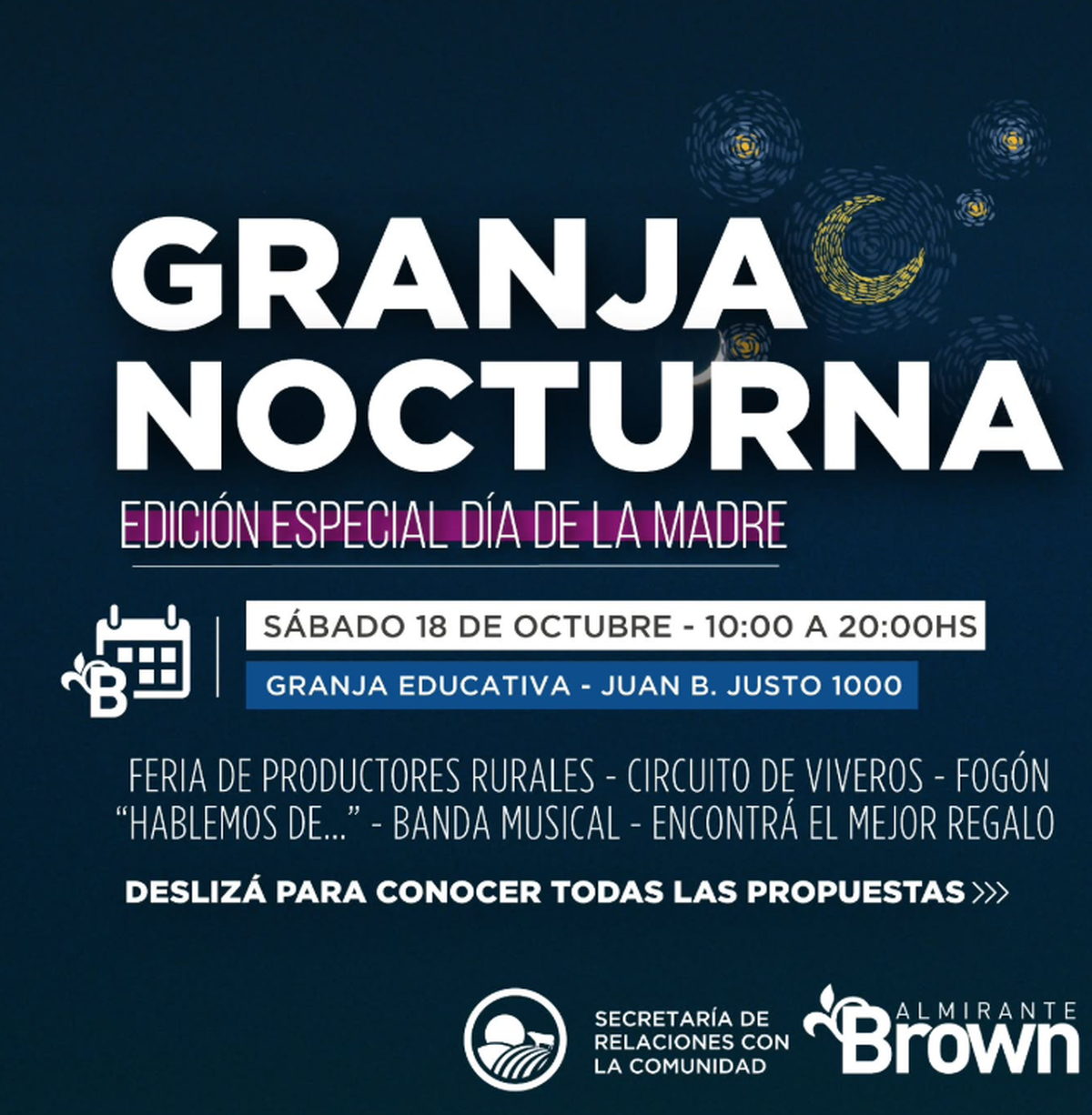 En Almirante Brown, el viernes 18 se realizará la Granja Nocturna y Especial Día de la Madre, una jornada al aire libre que invitará a recorrer ferias de productores rurales y viveros locales. También habrá charlas sobre el ambiente, promociones con Cuenta DNI y un cierre musical a cargo de Ñancara Wancolahuen. La actividad se extenderá de 10 a 20.