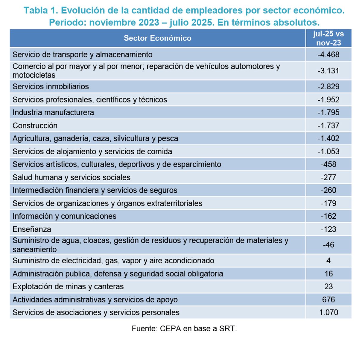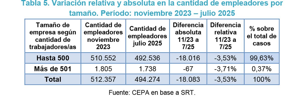 En el plano nacional, entre noviembre de 2023 y julio de 2025 se perdieron más de 18.000 empleadores con personal registrado. El número total pasó de 512.357 a 494.274, lo que implica una baja de casi 30 empresas por día.