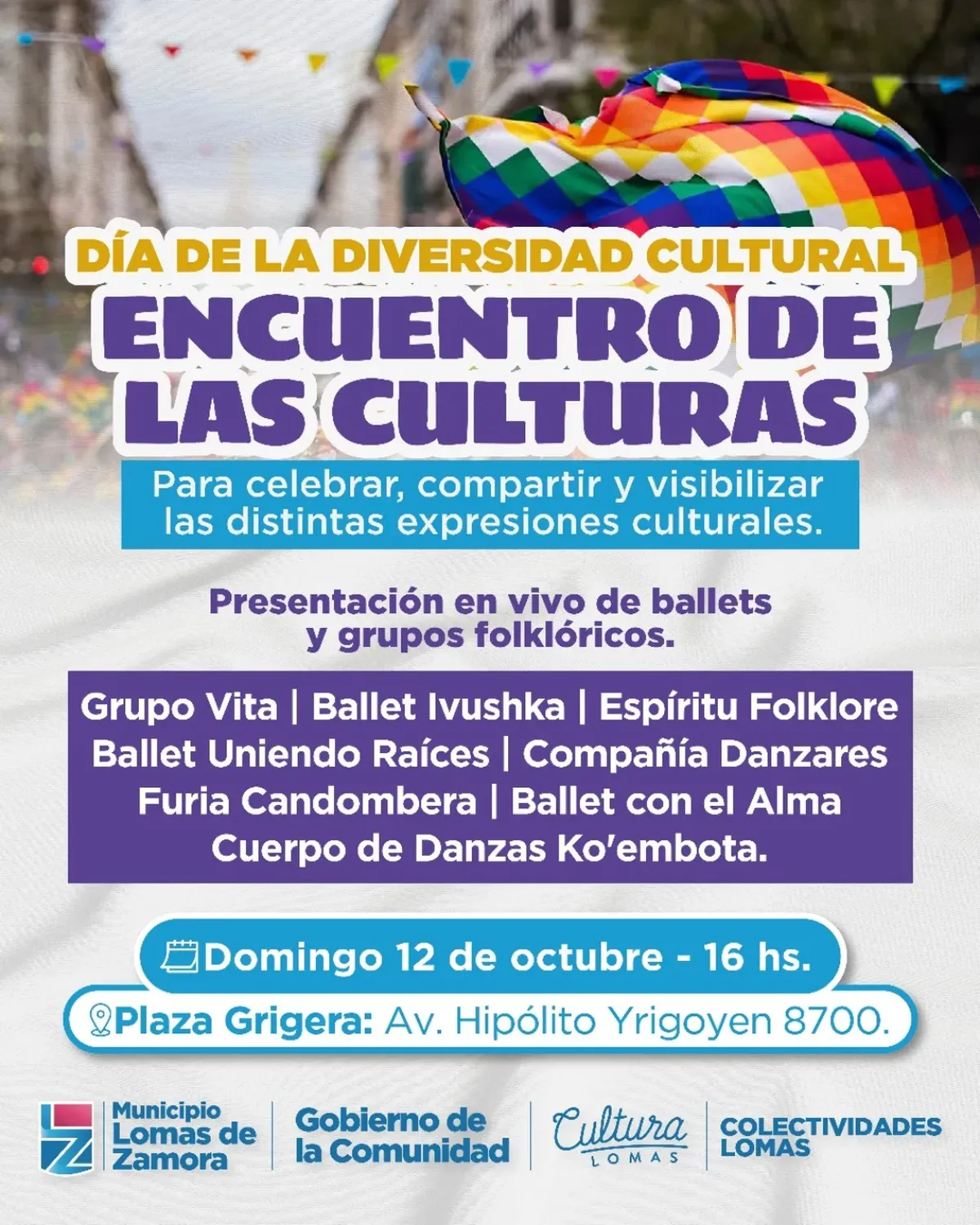Este domingo, la Plaza Grigera (Hipólito Yrigoyen 8700) será escenario de una jornada dedicada al Día de la Diversidad Cultural. Desde temprano, se presentarán grupos de ballet y agrupaciones folklóricas locales con espectáculos en vivo para toda la familia. La propuesta, impulsada por el Municipio, busca compartir y visibilizar las distintas expresiones culturales que conviven en la región.