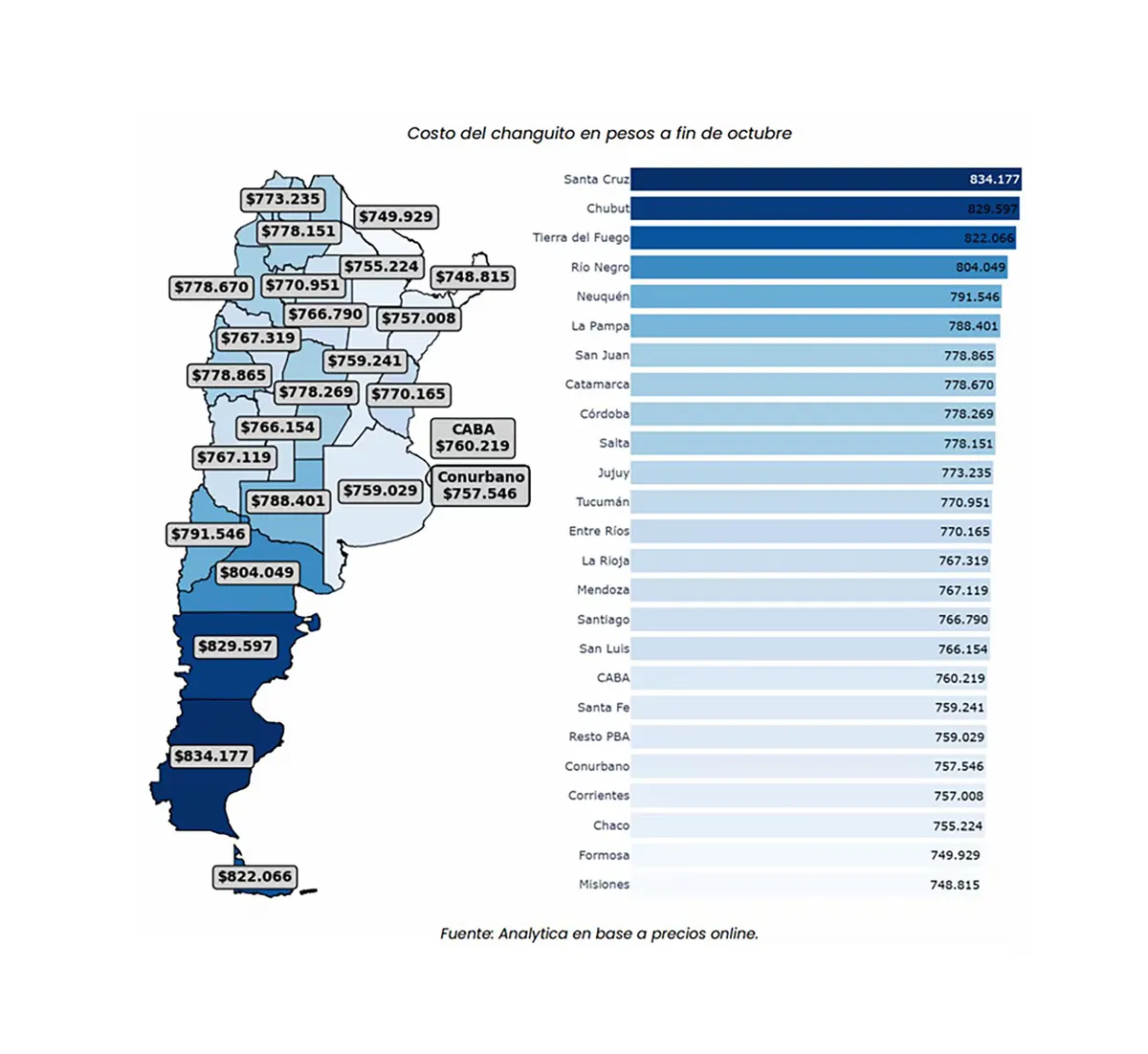 El costo total de la canasta fue más alto en Santa Cruz ($834.177), seguida por Chubut ($829.597) y Tierra del Fuego ($822.066). En el otro extremo, los valores más bajos se registraron en Misiones ($748.815), Formosa ($749.929) y Chaco ($755.224). El conurbano bonaerense se ubicó en una franja intermedia, con un costo estimado en $757.546.