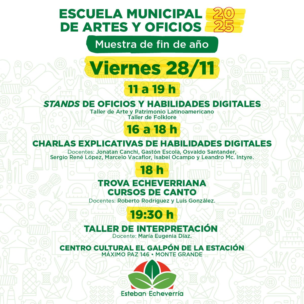 La Escuela Municipal de Artes y Oficios de Esteban Echeverría realizará su muestra de fin de año el viernes 28 de noviembre en el Centro Cultural El Galpón de la Estación, ubicado en Máximo Paz 146, Monte Grande.