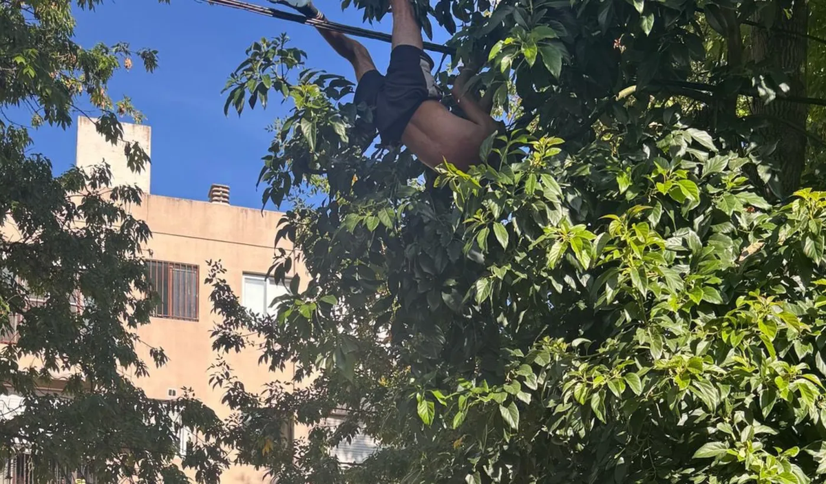El rescate ocurrió en La Plata. Los vecinos montaron un operativo para desenganchar al joven de los cables cuando intentaba bajar paltas de un árbol.