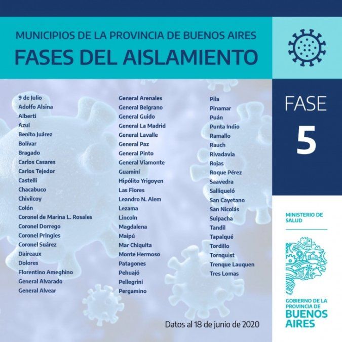 La mitad de los partidos de la Provincia se encuentran en fase 5, mientras que el conurbano permanece en el aislamiento social de la fase 3.