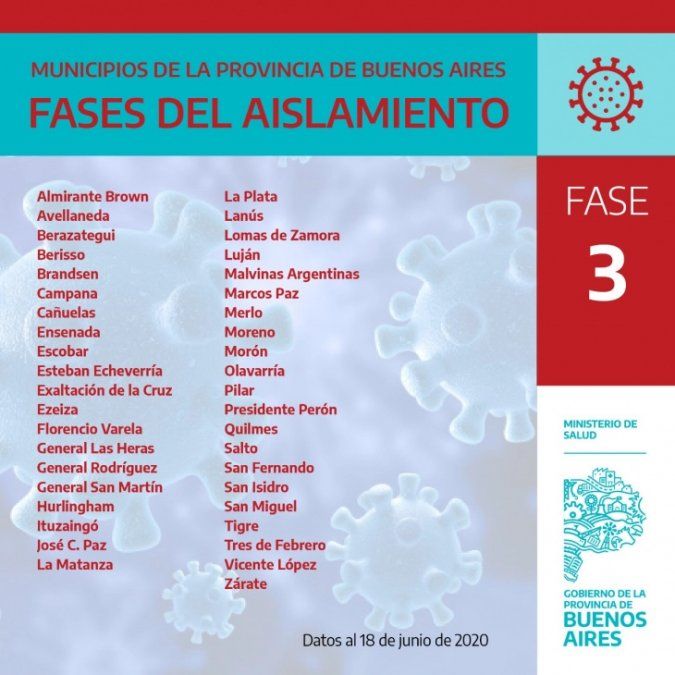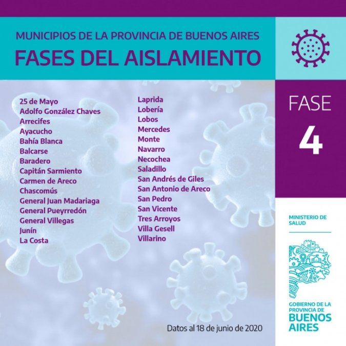 De los 135 municipios que posee la Provincia, 41 se encuentran ubicados en el Área Metropolitana de Buenos Aires (AMBA) y permanecen en la fase 3, mientras que ya son 30 los partidos que lograron superar esa etapa y se encuentran en la 4, esperando a erradicar los casos para llegar a la “nueva normalidad” de este aislamiento social.