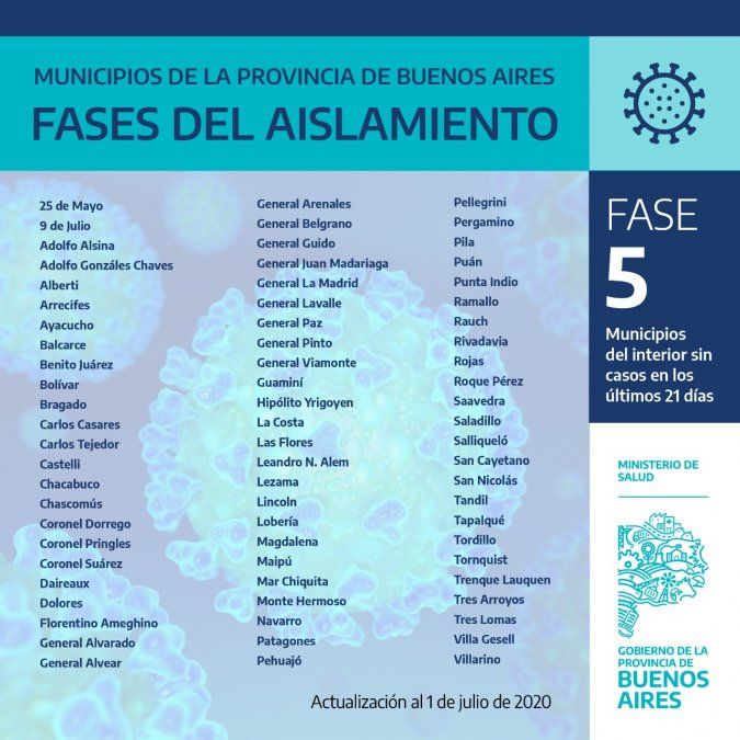 Finalmente, son 72 los municipios bonaerenses que se encuentran en fase 5 ya que que no registran casos de coronavirus en los últimos 21 días.
