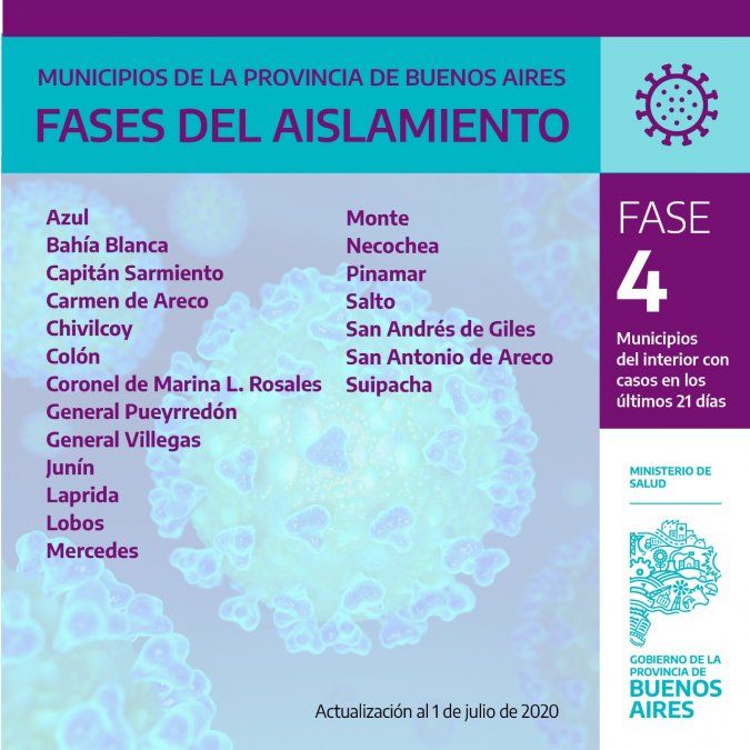 Por otro lado se encuentran hoy en fase 4, de acuerdo a la lista de la Provincia, los municipios de Azul, Bahía Blanca, Capitán Sarmiento, Carmen de Areco, Chivilcoy, Colón, Coronel Rosales, General Pueyrredon, Villegas, Junín, Laprida, Lobos, Mercedes, Monte, Necochea, Pinamar, Salto, San Andrés de Giles, San Antonio de Areco y Suipacha.