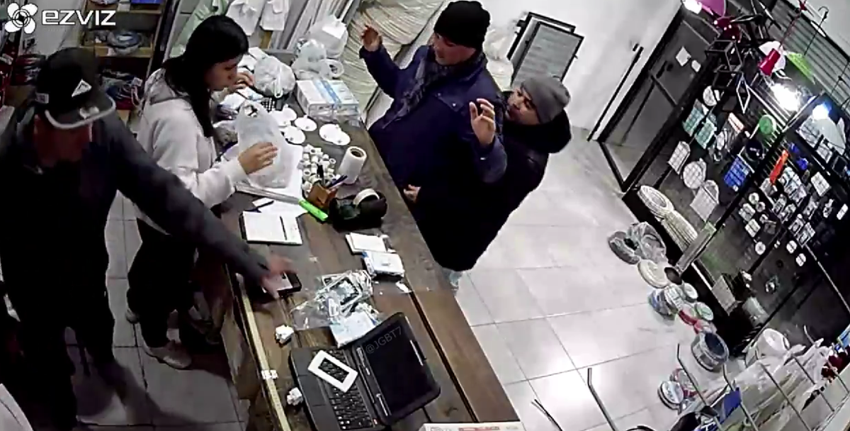 En la tensa escena en la que le apuntaba a las costillas con una pistola, el delincuente le revisaba toda la ropa en busca de objetos de valor. A su vez, el otro ladrón cruzó el mostrador, donde se encontraban dos empleados, y comenzó a exigirles dinero y objetos. Agarró dinero y un teléfono celular que se encontraba apoyado en la mesa.
