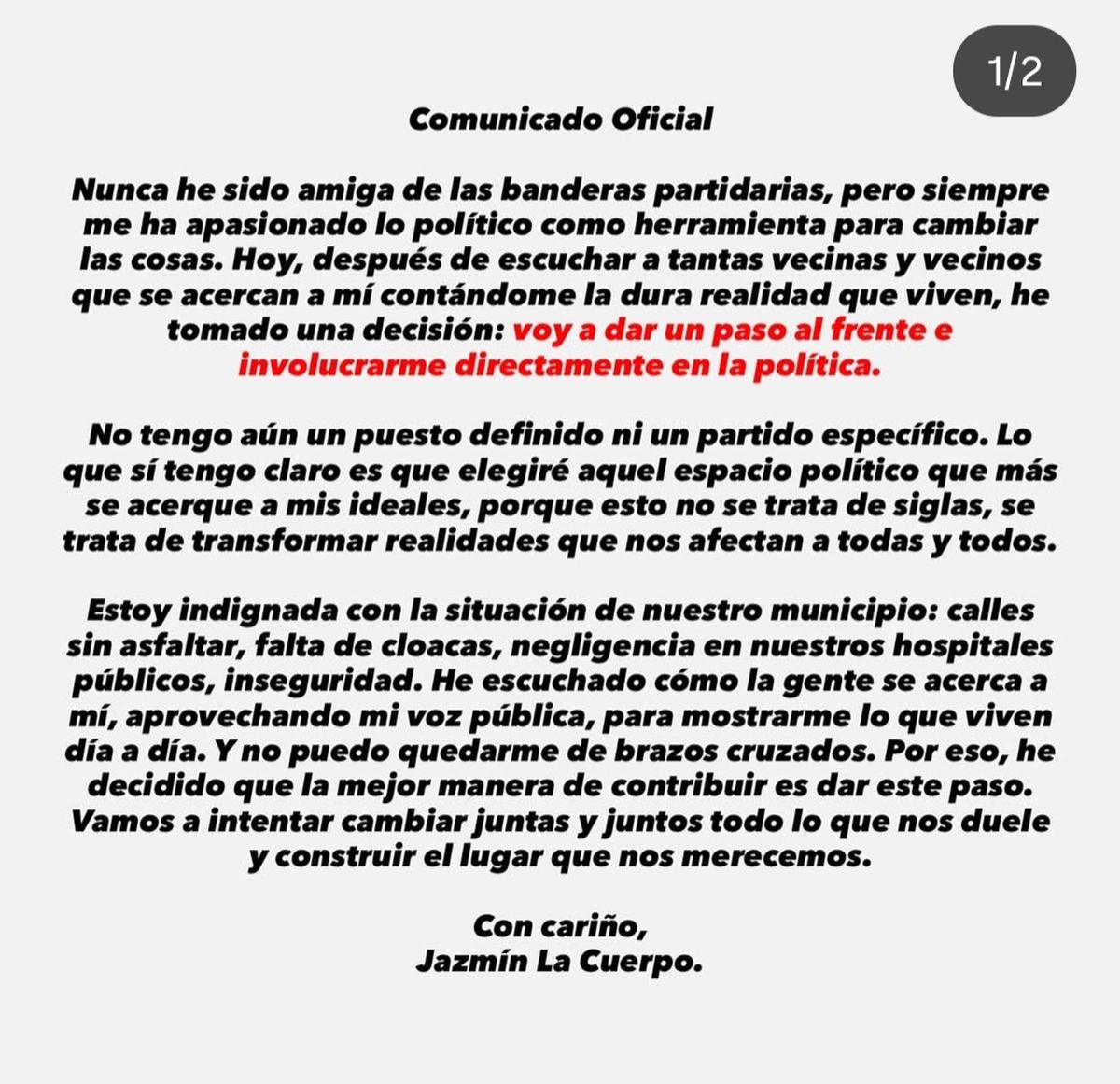 “Voy a dar un paso al frente e involucrarme directamente en la política”, manifestó la también cantante en el texto compartido en su perfil. En el mismo mensaje, aclaró que no tiene definido aún "un cargo ni un partido específico", aunque adelantó que se sumará a aquel espacio que “más se acerque” a sus ideales.