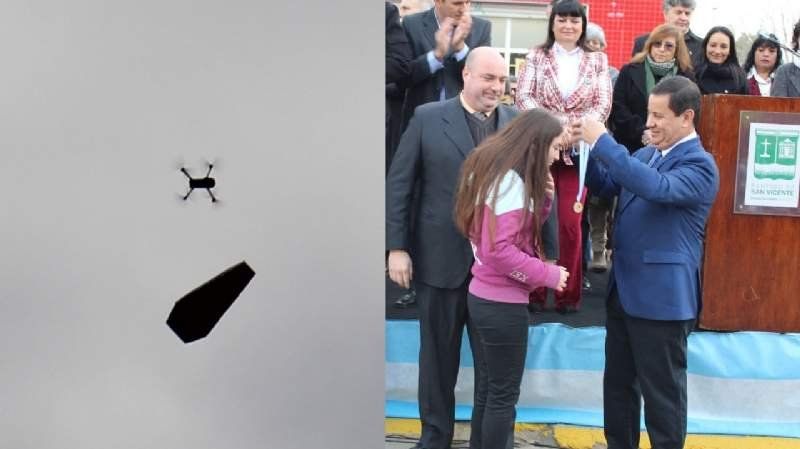 El desfile patrio por el 9 de Julio en Alejandro Korn tuvo una sorpresa desagradable: cuando el intendente Mauricio Gomez finalizó su discurso, un drone apareció en la zona del palco principal con un ataúd de cartón colgando.