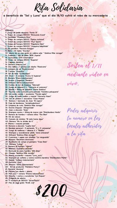 La solidaridad de otros comerciantes del centro de San Vicente, quienes están reunidos en un grupo de Whatsapp, llevó a que se organice una rifa solidaria, donde todos pusieron a disposición algo de su mercadería. Se juntaron más de 67 premios de todos los rubros y comercios y la rifa, que tiene un costo de 200 pesos, se llevará a cabo el 1 de noviembre.