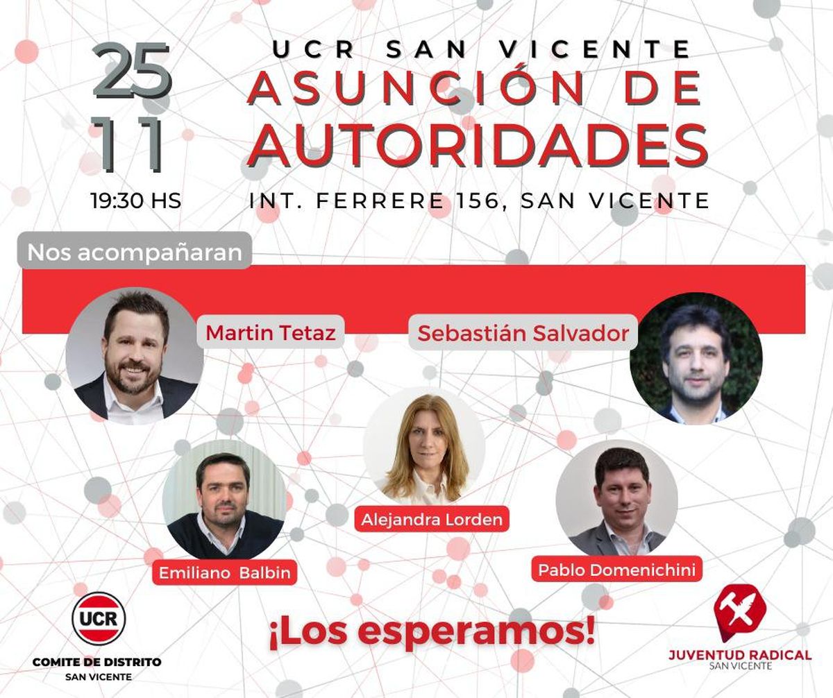 Allí se concretará el recambio de autoridades partidarias locales. La concejal Graciela Biscaldi asumirá como nueva presidenta de la UCR de San Vicente en reemplazo del saliente Federico Cantó. Andrés Ruso asumirá como vicepresidente, Mikaela Caresani será la nueva tesorera y Facundo Landaburo el secretario general. Por la Juventud Radical, asumirán roles Camila Etcheverry y Agustín Arechavala.