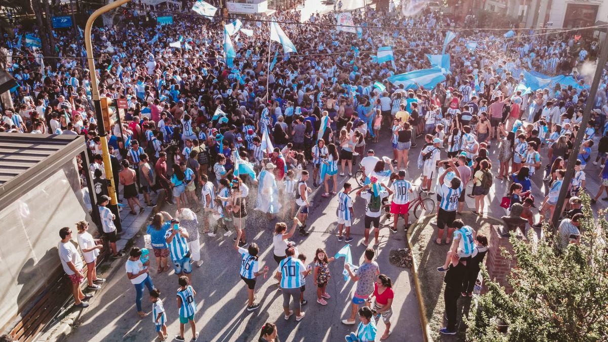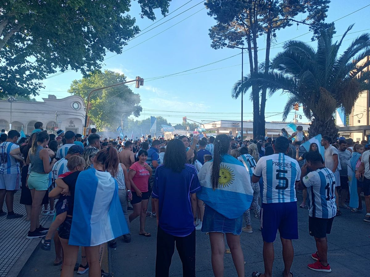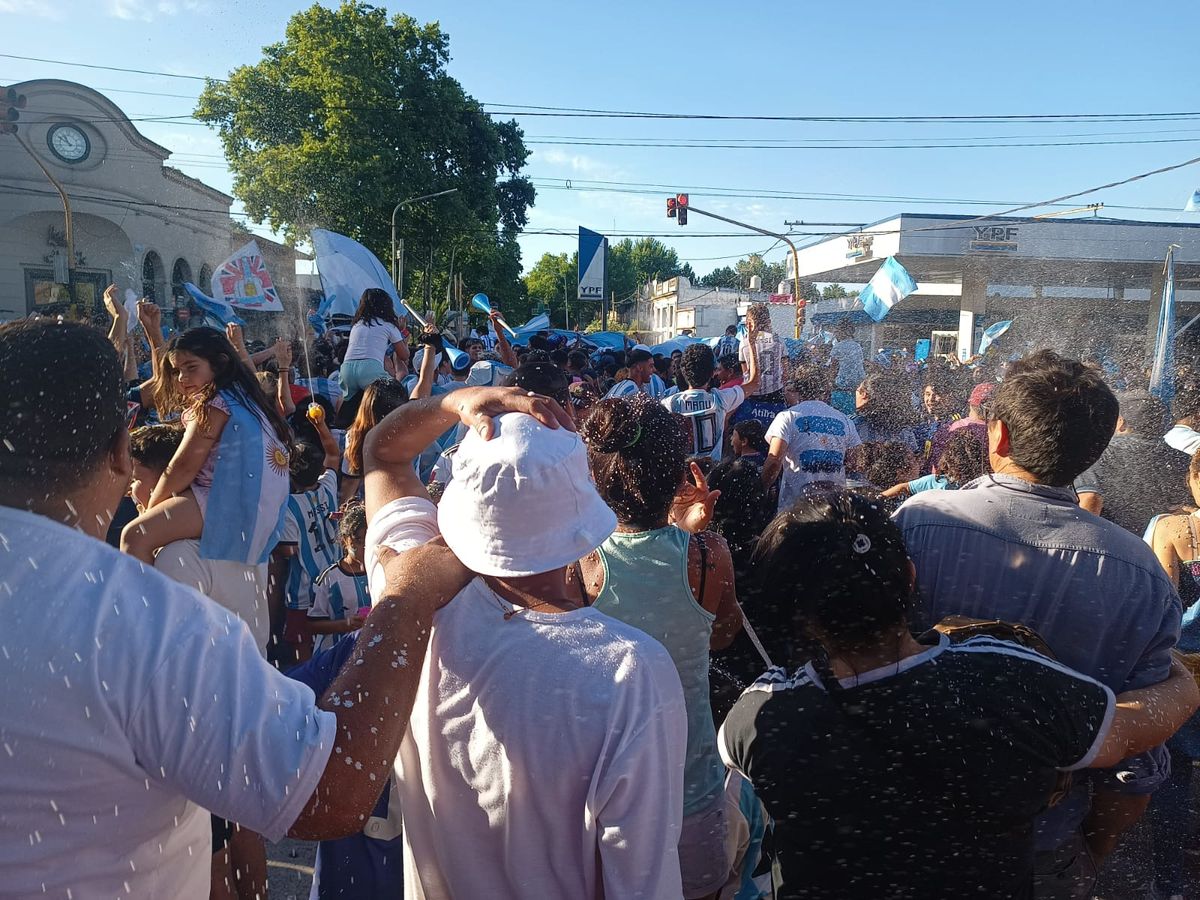 El epicentro del festejo es la Plaza Mariano Moreno, frente al palacio municipal. Una multitud, con una remarcada presencia de niños, se concentra con camisetas celestes y blancas, banderas argentinas y hasta espuma de carnaval.