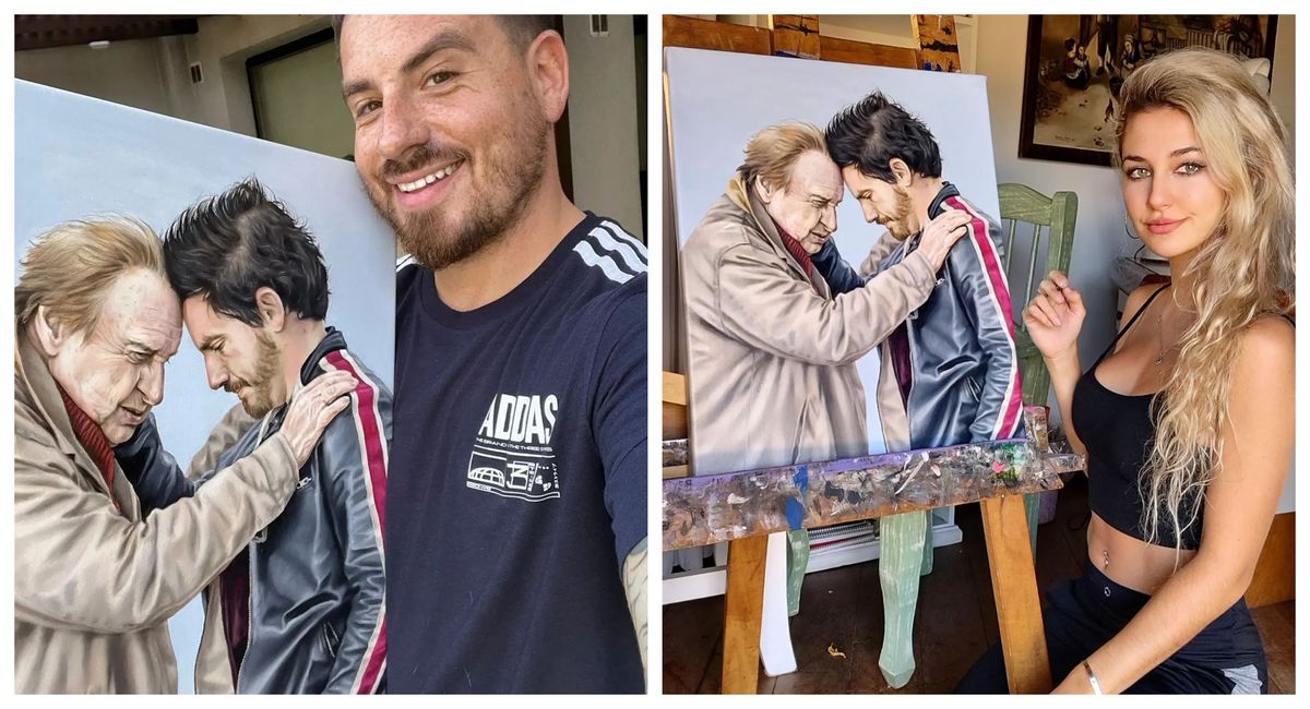“La obra me la encargó un amigo de Fede Bal que es el cliente mío y para el que yo ya hice otros trabajos. Él quería que fuera una imagen de Fede con su padre. Una vez que decidimos sobre qué foto trabajar empecé con la obra, que me llevó dos meses. La semana pasada se la hice llegar y Fede se emocionó mucho y me agradeció”, sostuvo Agostina Mauro en diálogo con El Diario Sur.