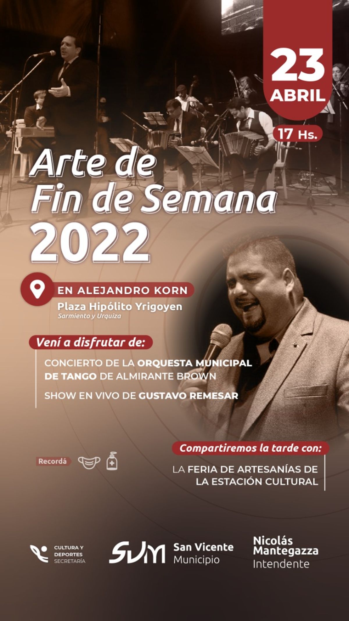 Este sábado 23 de abril, Alejandro Korn se viste de fiesta para asistir al "Arte de Fin de Semana", un evento en el que habrá un concierto de la Orquesta Municipal de Tango de Almirante Brown y un show en vivo del cantante Gustavo Remesar, ganador del Soñando por Cantar.