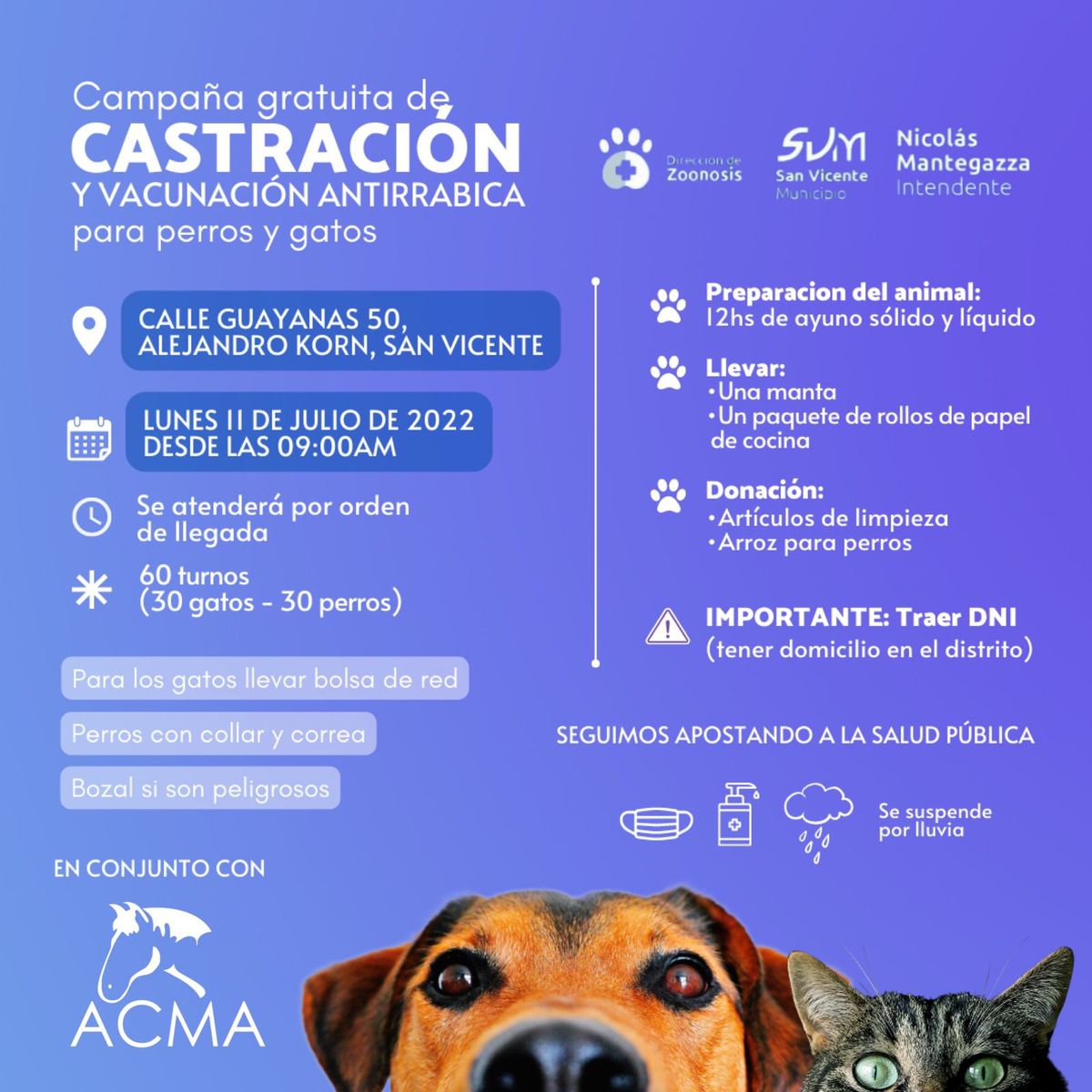 La municipalidad de San Vicente invita a que los participantes se acerquen con donaciones de artículos de limpieza y arroz para perros. Cualquiera de las dos jornadas se suspenderán en casa de lluvia.