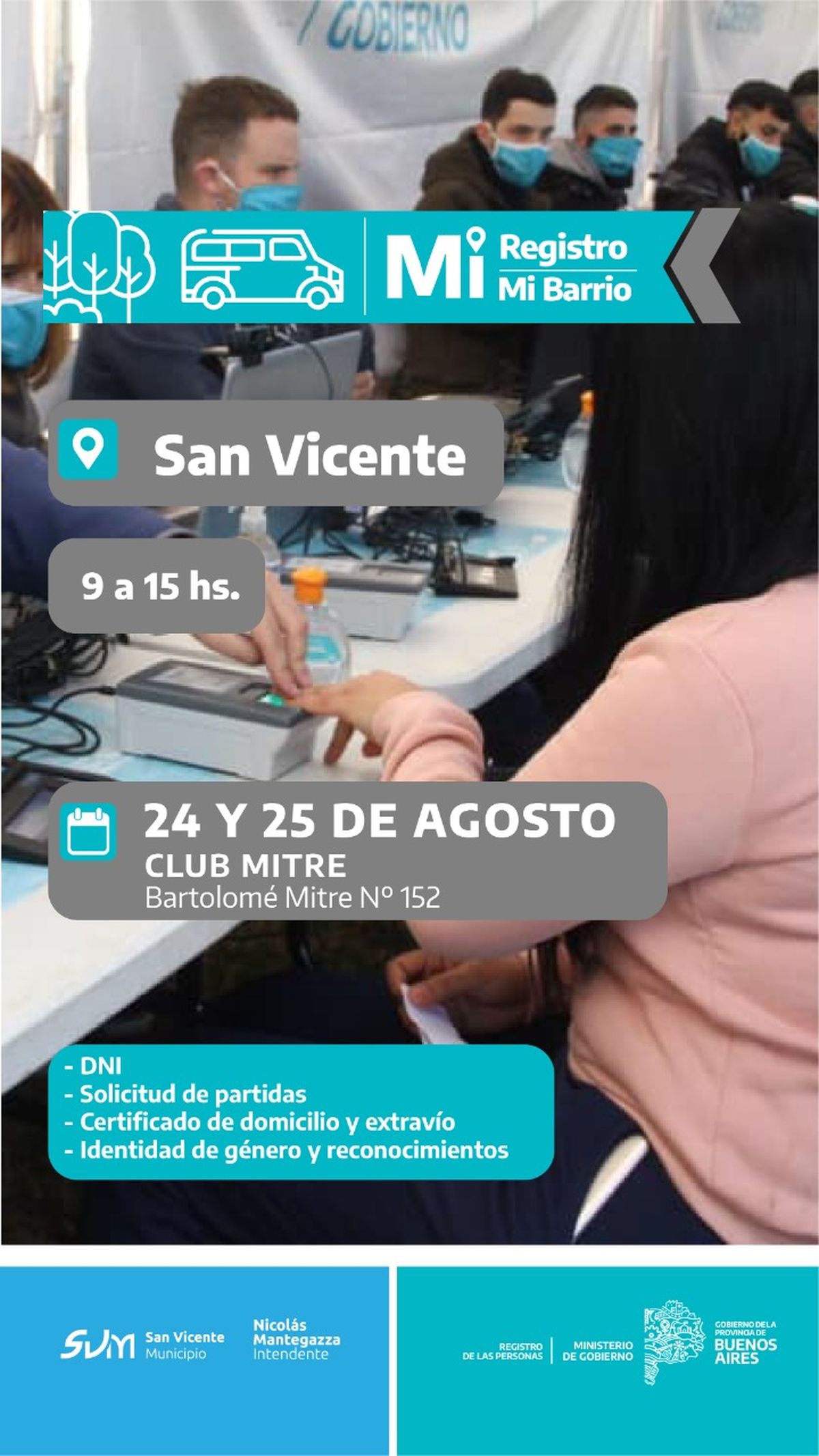 Por otro lado, para los operativos DNI deberán ir al Club Mitre (Bartolomé Mitre 152) de 9 a 15hs, tanto el 24 como el 25 de agosto.