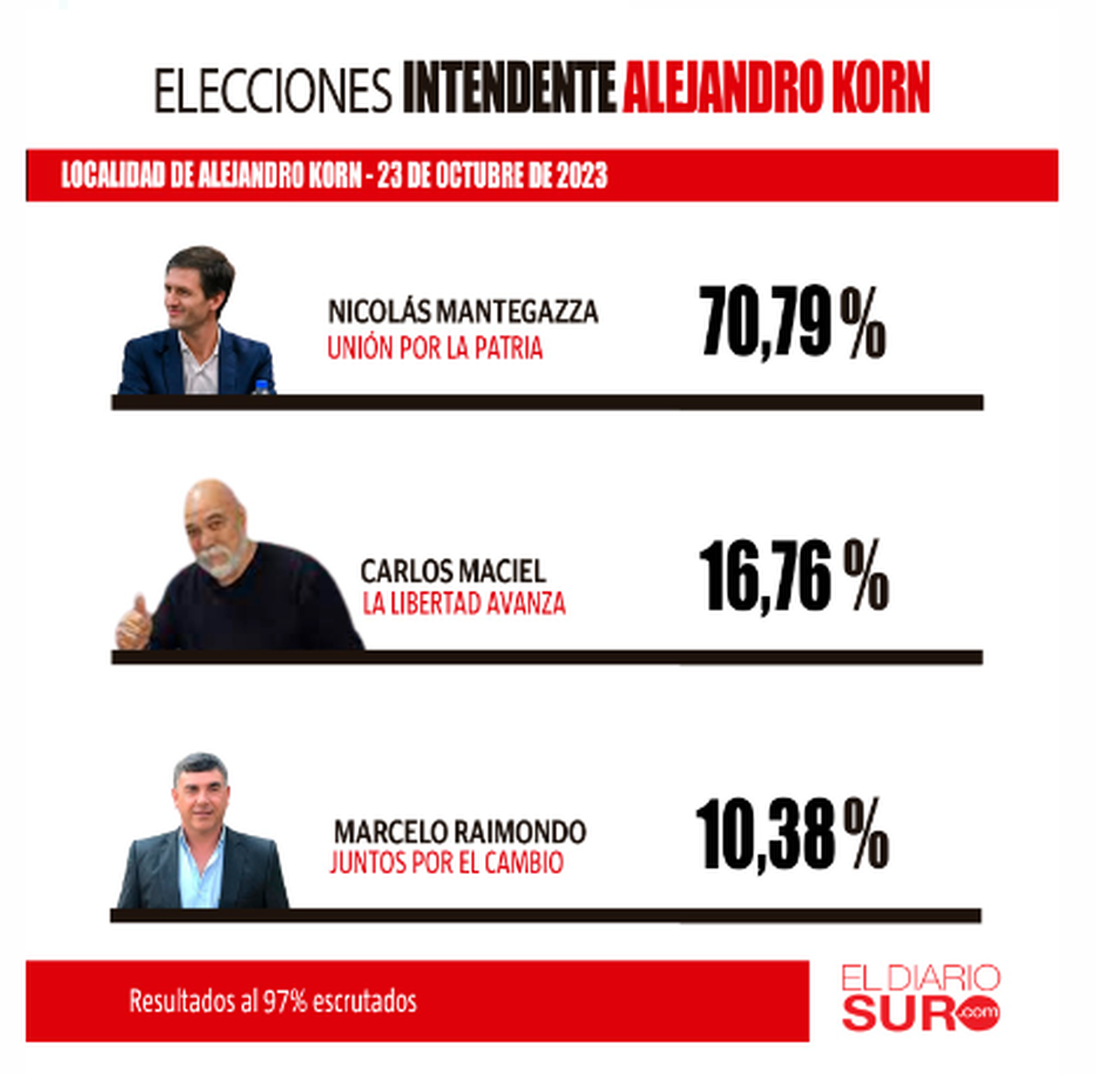 En cuanto al comportamiento de los electores divididos por localidades, el oficialismo obtuvo una ventaja arrasadora en Alejandro Korn. Allí Mantegazza llegó al 70%, contra 16% de Maciel y 11% de Raimondo. En la localidad de San Vicente, UP 62%, LLA 19% y JxC 16%. Finalmente, en Domselaar, UP 68%, LLA 18% y JxC 11%.