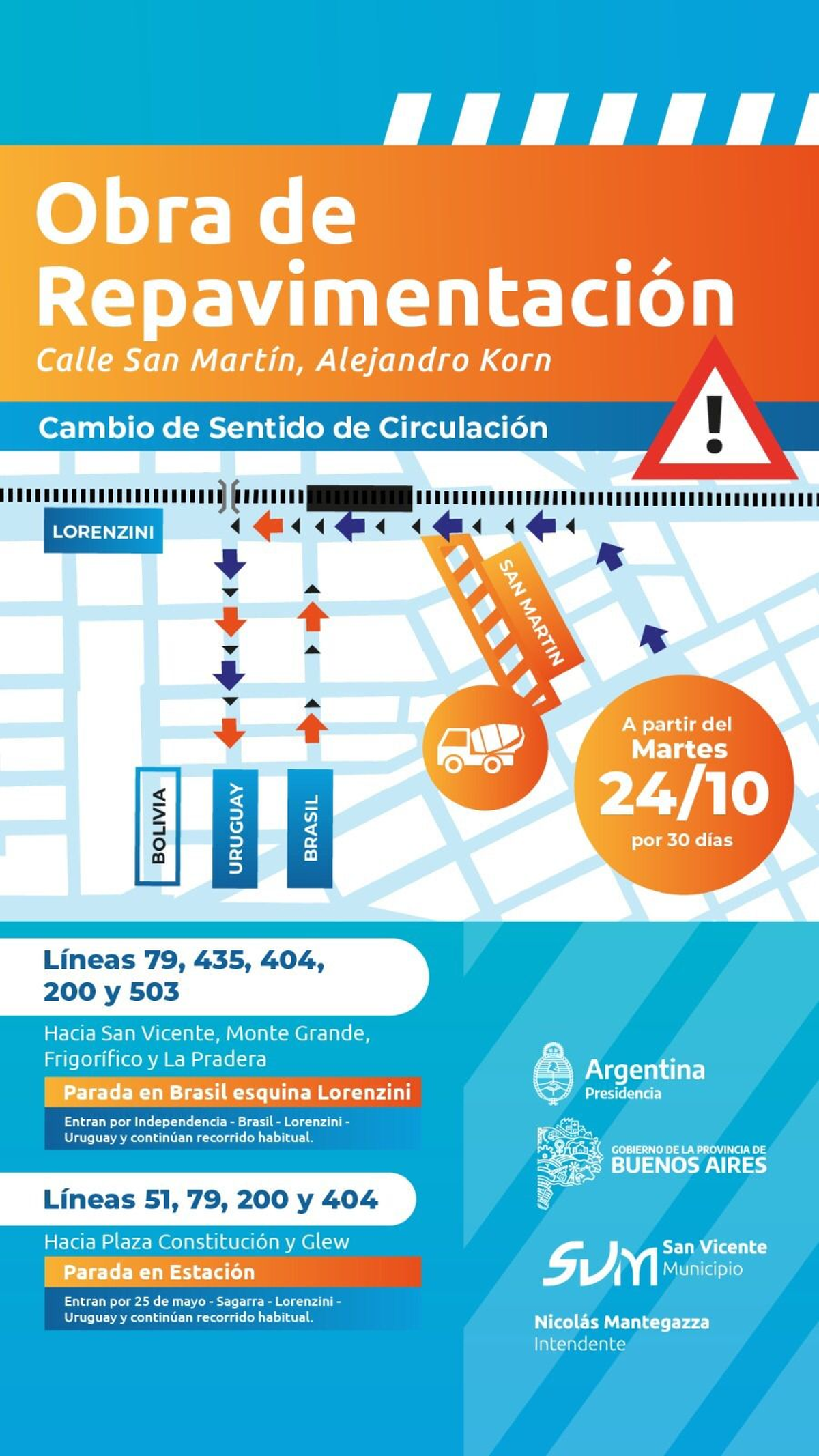 El Municipio de San Vicente inicia este martes la obra de repavimentación de la avenida San Martín, en el centro de Alejandro Korn. El tramo de 300 metros de San Martín entre Lorenzini e Independencia quedó cerrado al tránsito y hay cambios en el sentido de circulación de las calles en los alrededores de la estación, que también afectan al recorrido de los colectivos. Esta situación se extenderá al menos por 30 días.