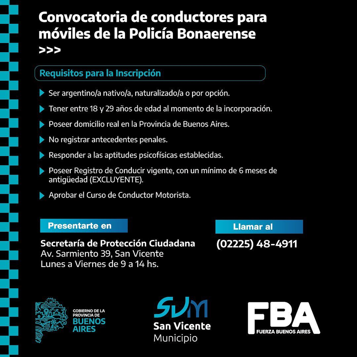 La municipalidad de San Vicente lanzó una convocatoria para sumar conductoras y conductores de patrulleros de la Policía Bonaerense.