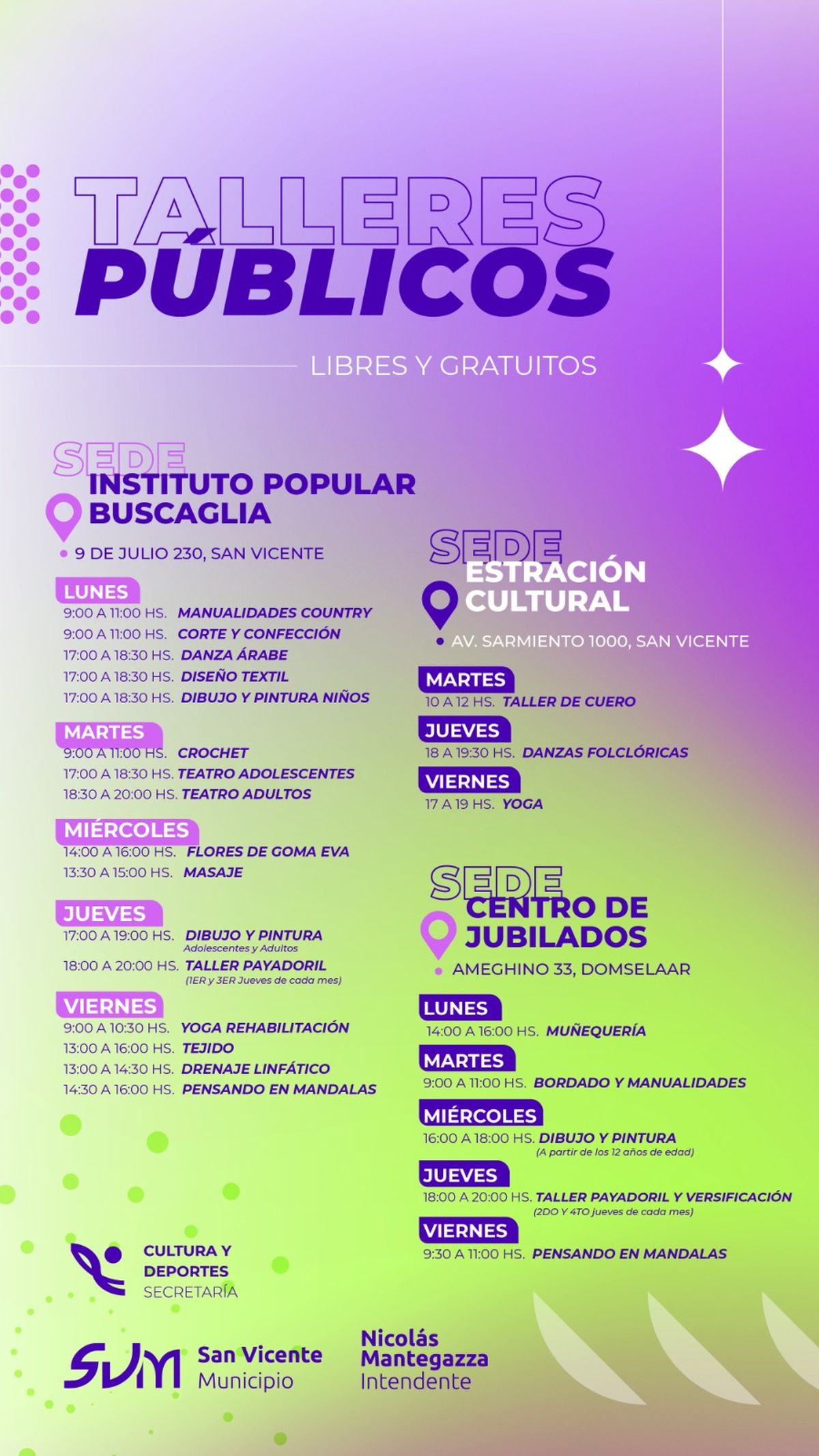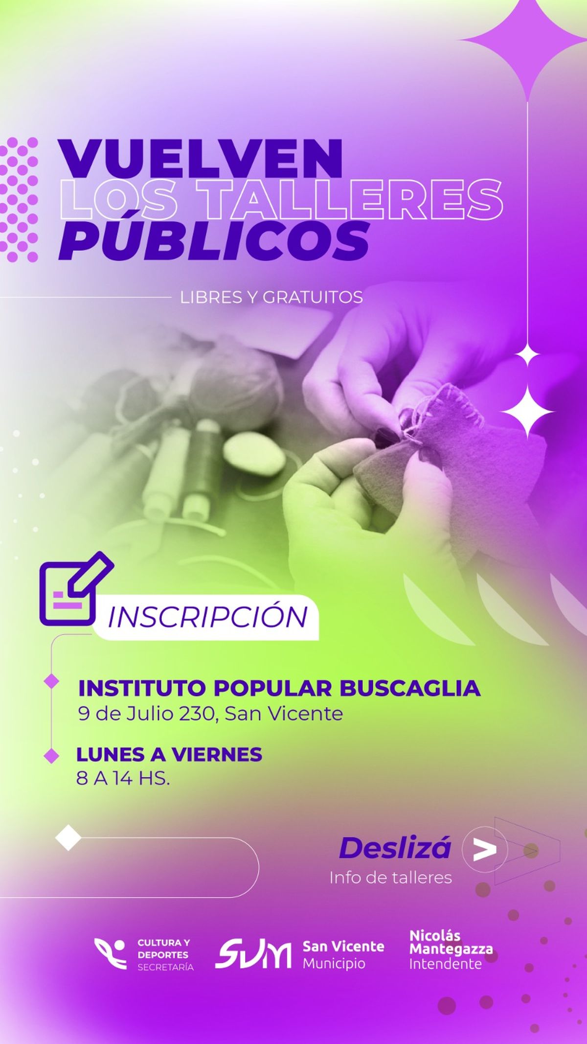 La municipalidad de San Vicente anunció que se encuentran abiertas las inscripciones para participar de talleres libres y gratuitos. La misma se deberá realizar de lunes a viernes de 8 a 14 horas en el Instituto Popular Buscaglia, ubicada en 9 de julio 230.