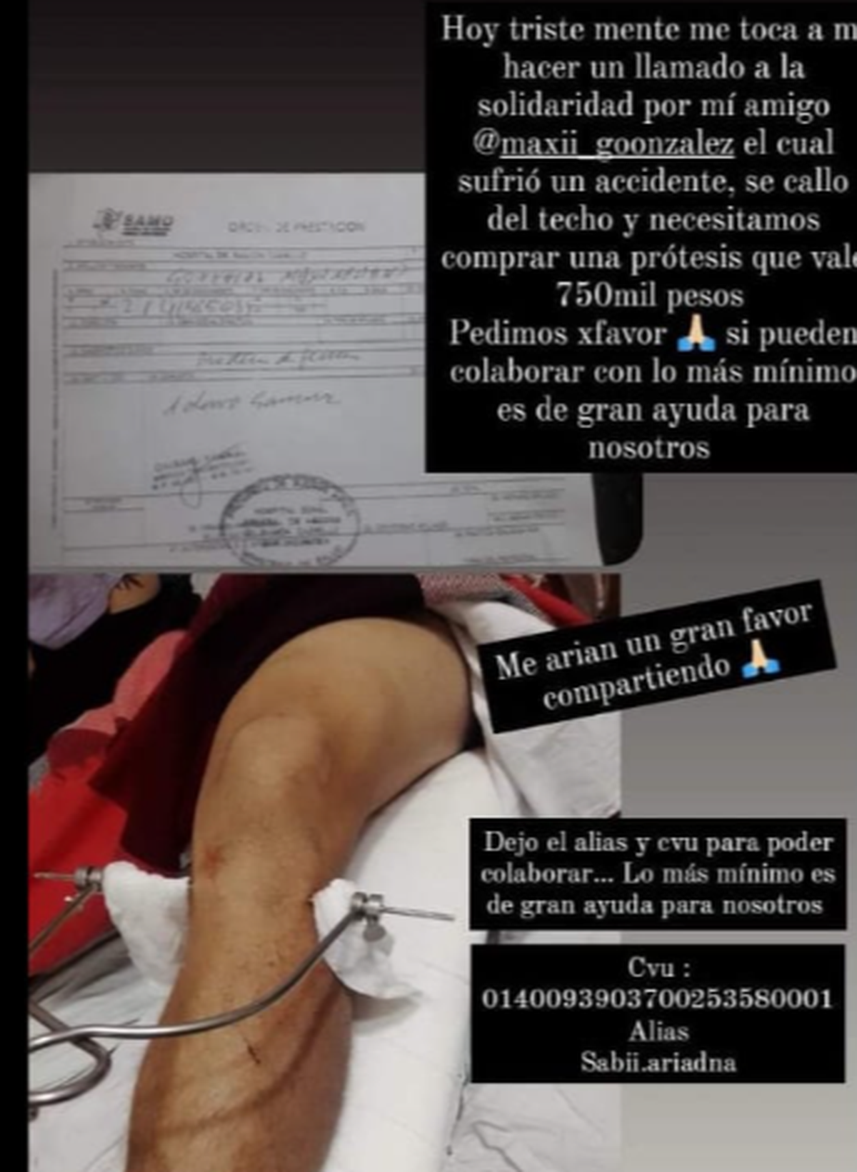 El accidentado se encuentra internado y a la espera de su tratamiento. "Le tenemos que comprar un clavo que vale 690.000 pesos. Si no se le pone el clavo se le va a generar una costra entre los huesos que lo puede dejar en silla de ruedas o rengo", expresó Sabina. Y añadió: "Le dieron 25 días aproximadamente para conseguirlo y que no le pase eso". Según indica la receta que los médicos le otorgaron al paciente, Maxi requiere un clavo endomedular gama de titanio.