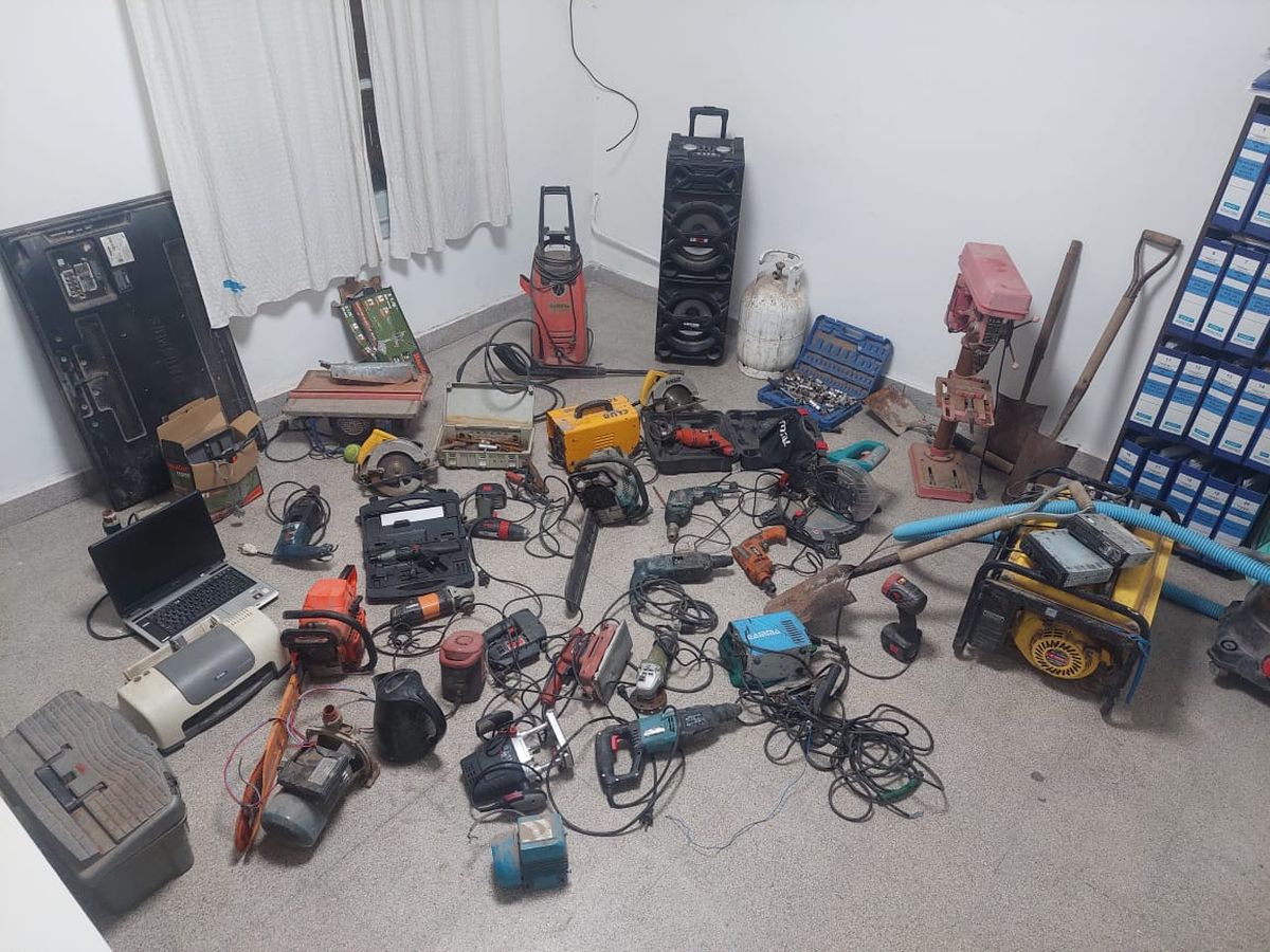 En los lugares allanados también había diferentes herramientas eléctricas de construcción como agujereadora, atornilladora, soldadora, percutor, taladros, sierra circular, prensa de taladro, hidrolavadora, motosierra, grupo electrógeno, palas, bomba centrífuga y más.
