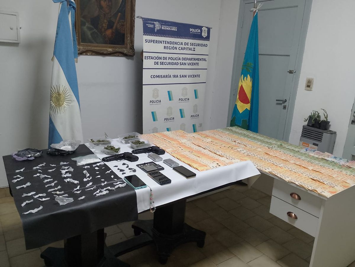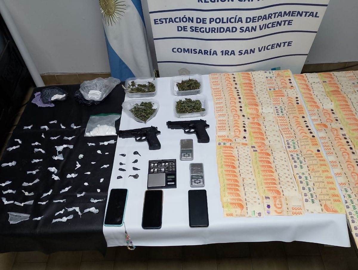 En los allanamientos en San Vicente secuestraron cocaína y marihuana fraccionadas, dinero en efectivo y otros elementos robados, como bicicletas y herramientas.