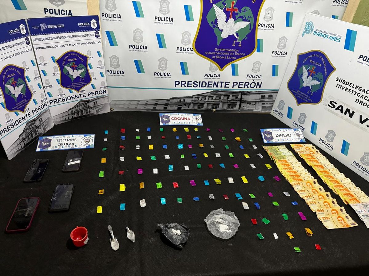 El procedimiento tuvo lugar en una vivienda ubicada sobre la calle Aragón al 500, en la localidad de Alejandro Korn. En el lugar, efectivos policiales secuestraron 98 envoltorios de cocaína hechos con papel glasé de colores, cuatro teléfonos celulares, 95.000 pesos en efectivo y recortes de nylon donde contenía la droga para luego fraccionarla.