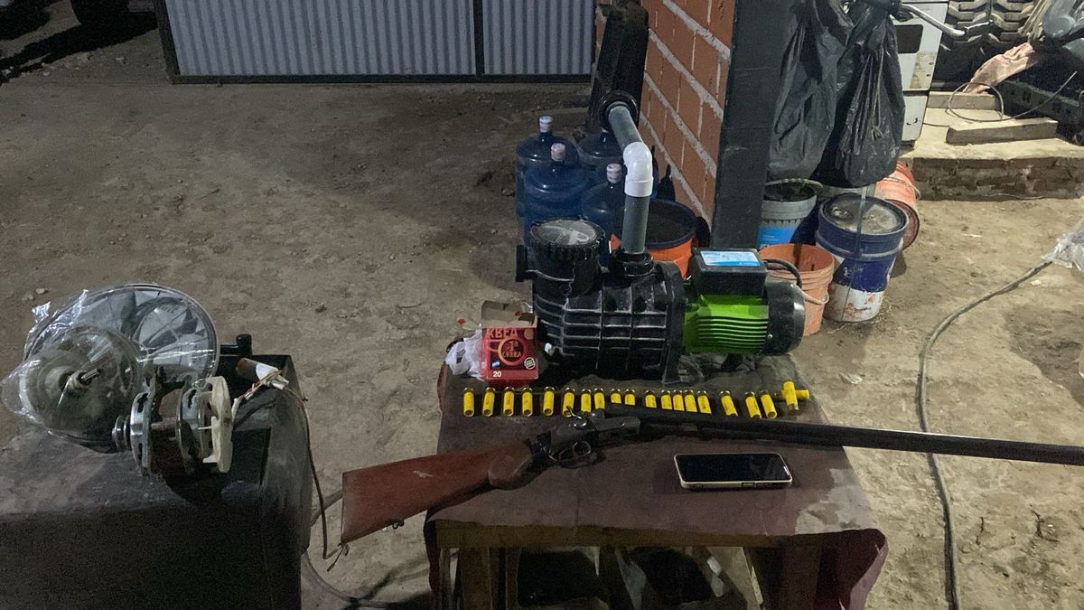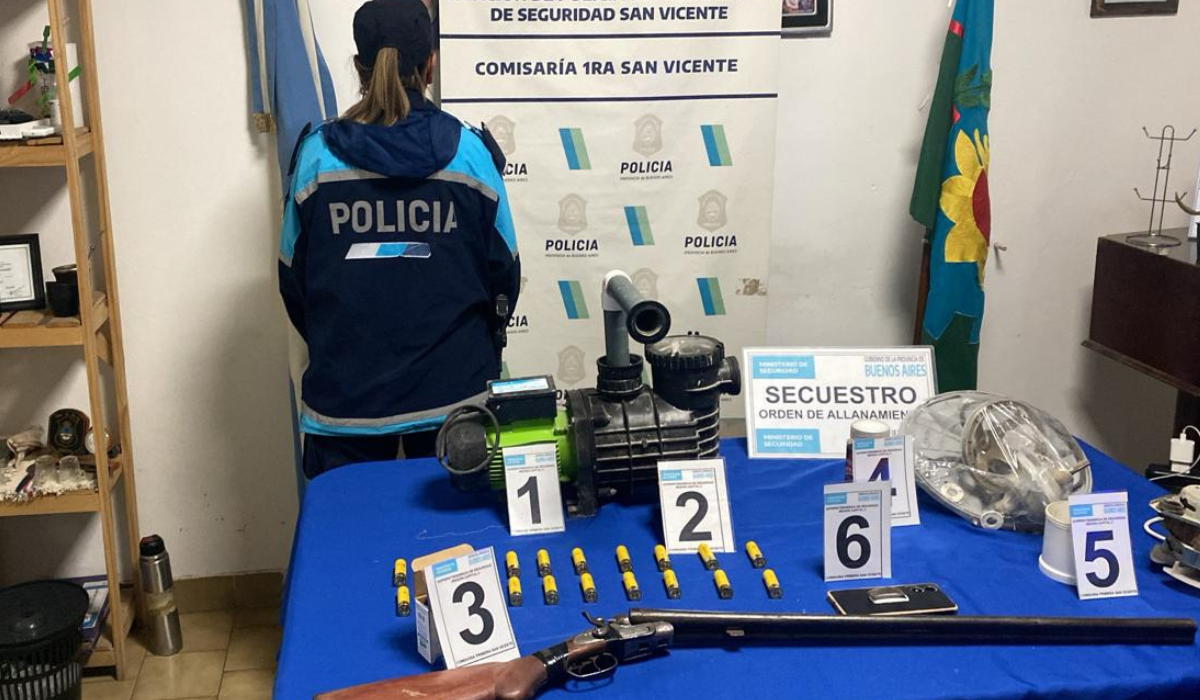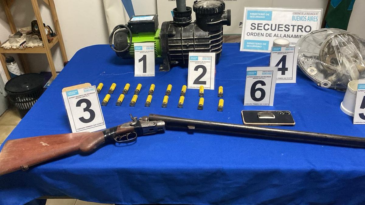 En el allanamiento secuestraron una escopeta calibre 20 con 20 municiones, una electrobomba centrífuga de pileta marca Fluvial, un motor de lavarropas y un teléfono celular. El procedimiento se realizó este sábado en una vivienda ubicada sobre la calle Capdeville, entre Zorrilla y Andrea Bello, en San Vicente.