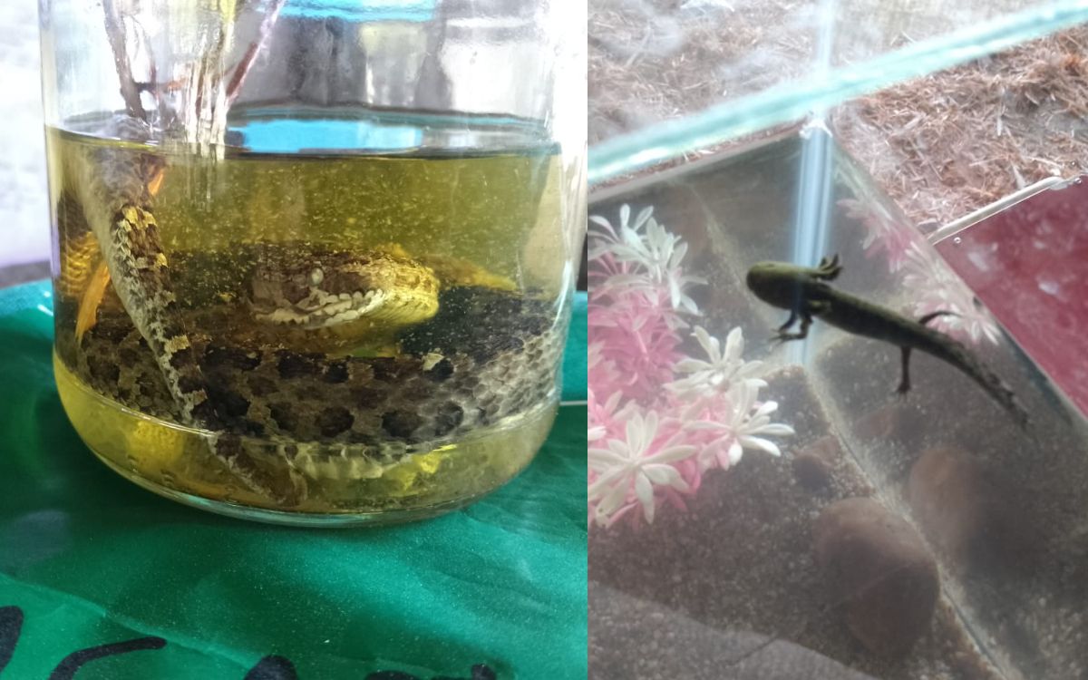 Los estudiantes de cuarto año Faustino y Tomás explicaron su proyecto sobre fauna nativa y exótica, que se centra en la importancia de los animales en el ecosistema. Para la muestra llevaron ejemplares vivos, entre ellos un ajolote, una lagartija gecko, y otros reptiles como pitones, boas y especies exóticas que no son originarias de Argentina. También, contaron que durante el año trabajaron en la puesta en condiciones de un sector del predio para poder exhibir los proyectos en la Expo.