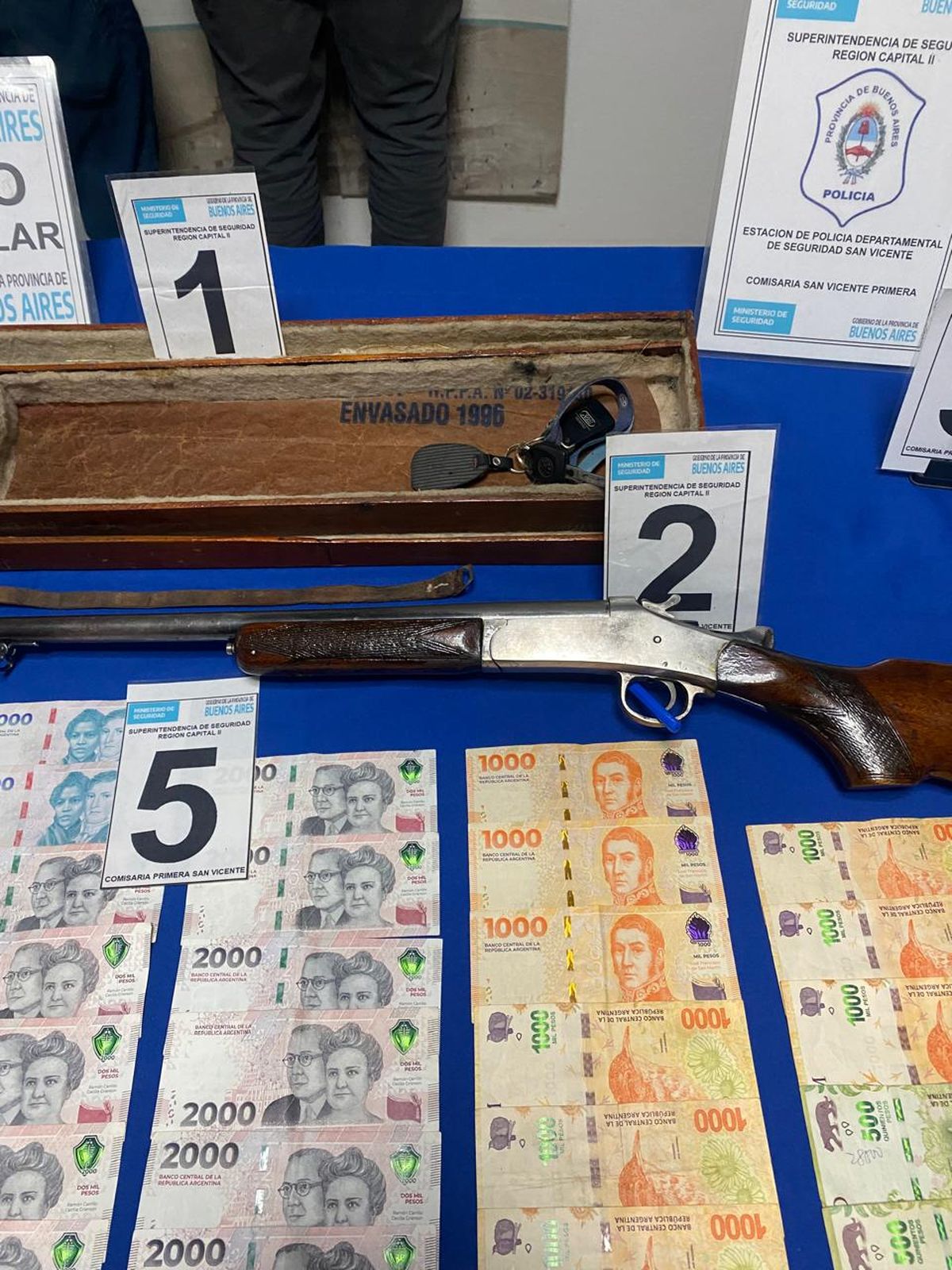 Entre los objetos incautados por la policía de San Vicente se encuentran una escopeta calibre 16 modelo Centauro de Lujo y 143 mil pesos en efectivo.