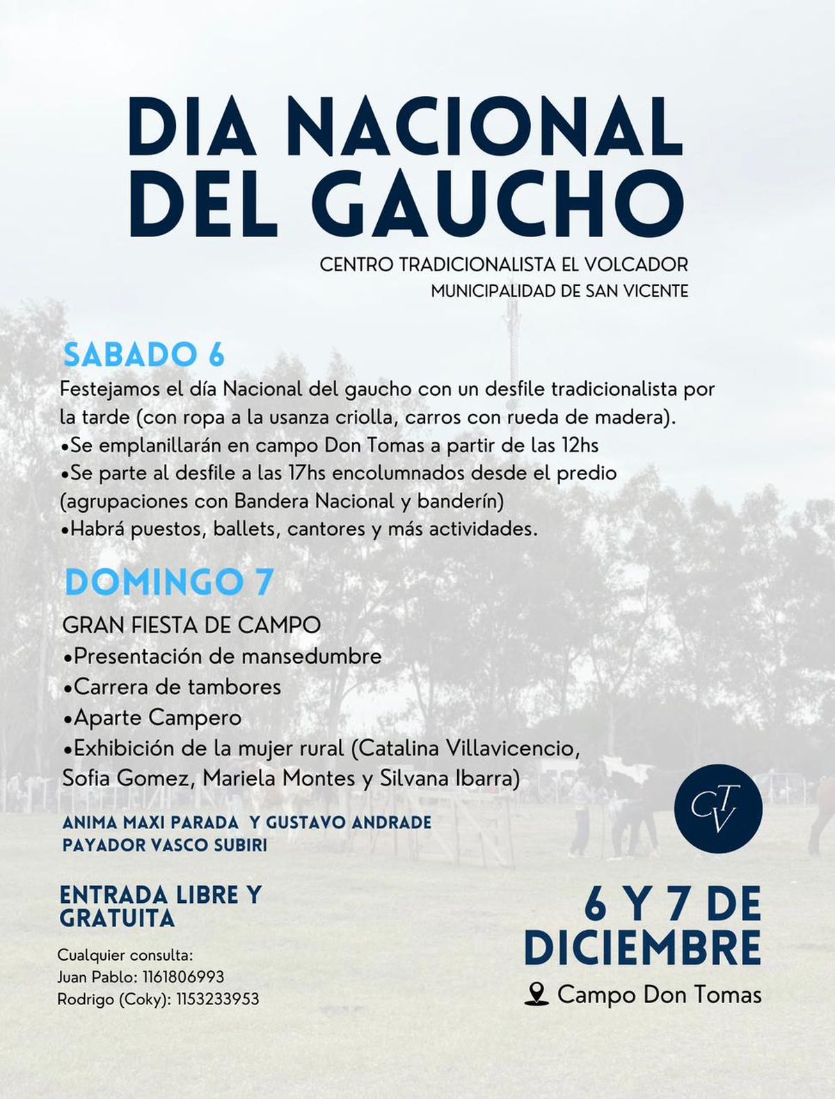 El Centro Tradicionalista El Volcador de San Vicente celebrará el Día Nacional del Gaucho con dos jornadas de actividades el 6 y 7 de diciembre en el Campo Don Tomás, ubicado en Río Cuarto 784. El evento, que cada año convoca a agrupaciones y vecinos de distintos puntos del distrito, volverá a reunir a la comunidad en torno a una de las fechas más significativas para la cultura criolla. Desde la organización adelantaron que el objetivo es sostener las tradiciones y promover la participación familiar en un encuentro abierto y gratuito.