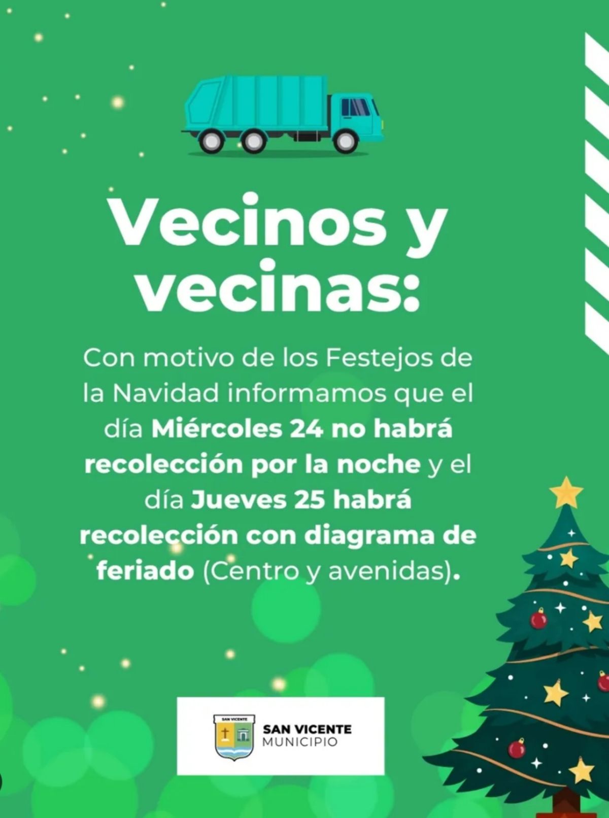 El Municipio de San Vicente informó cómo funcionará la recolección de residuos durante las celebraciones de Navidad. También, se informaron los cambios en los horarios en el transporte público.