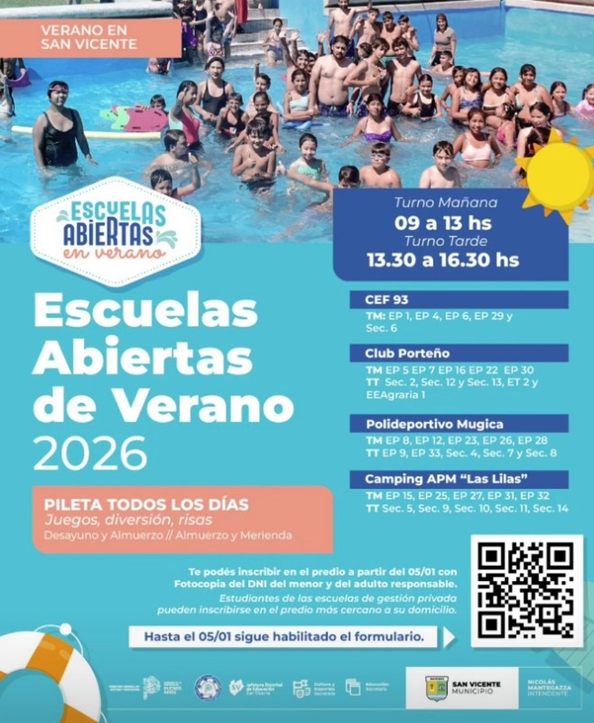 La Secretaría de Educación del Municipio de San Vicente informó los turnos y sedes del programa Escuelas Abiertas de Verano 2026 destinado a chicos y chicas de los niveles Inicial, Primario y Secundario del distrito.