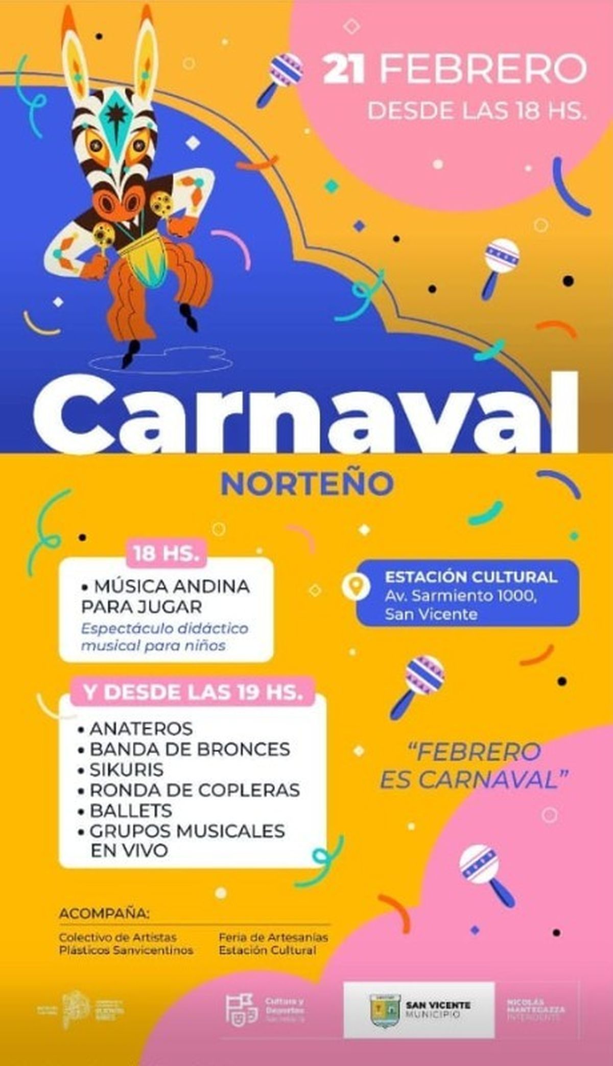 El próximo sábado 21 de febrero se realizará un Carnaval Norteño en San Vicente, con actividades libres y gratuitas previstas desde las 18 horas en la Vieja Estación Cultural, ubicada en avenida Sarmiento 1000.