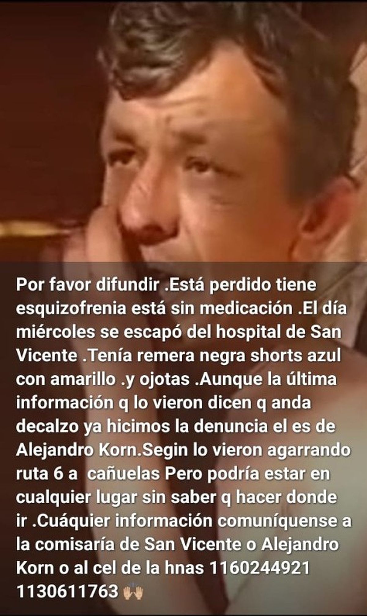 Desde la familia pidieron que, ante cualquier dato, se dé aviso inmediato a la policía de Alejandro Korn o de San Vicente, o que se comuniquen directamente con sus hermanas. Los teléfonos de contacto son Naty: 11-6024-4921 y María: 11-3061-1763. La familia insiste en la necesidad de colaboración para poder localizarlo y garantizar que reciba la atención correspondiente.