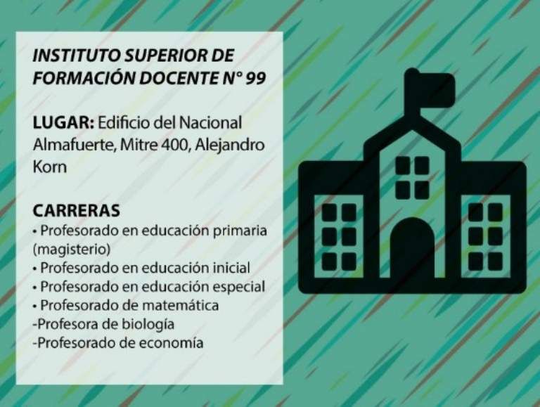 La matrícula del Instituto Superior de Formación Docente N° 99 es de 850 alumnos, según calcula su director, Héctor Echevarne. Las clases se dan en el edificio del colegio Nacional Almafuerte de Alejandro Korn, y el abanico de carreras es amplio: educación inicial, educación primaria, educación especial, matemática, biología y economía. Las tres primeras, por la alta demanda laboral que tienen, son las más elegidas.