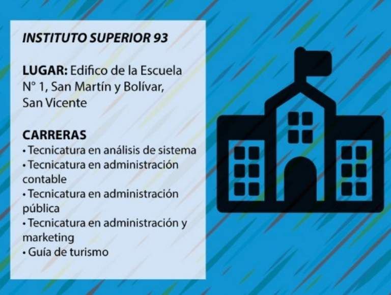 El instituto N° 93 tiene un perfil técnico. La cooperadora cobra una cuota de apenas $ 400 al año. El período de inscripción es en diciembre y febrero, entre las 19 y las 21 horas. El teléfono es 02225 481 175. Las carreras duran tres años y se cursan a la noche.