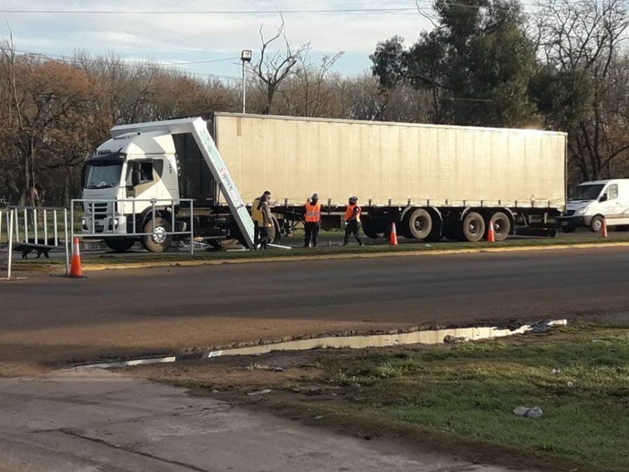 El hecho ocurrió alrededor de las 9 de la mañana, en el control vehicular de la ruta 210 a la altura del Polideportivo Padre Mugica. El chofer del camión de gran porte intentó atravesar el arco sanitizante y logró pasar con la cabina del vehículo, pero lo embistió con el acoplado de gran altura.