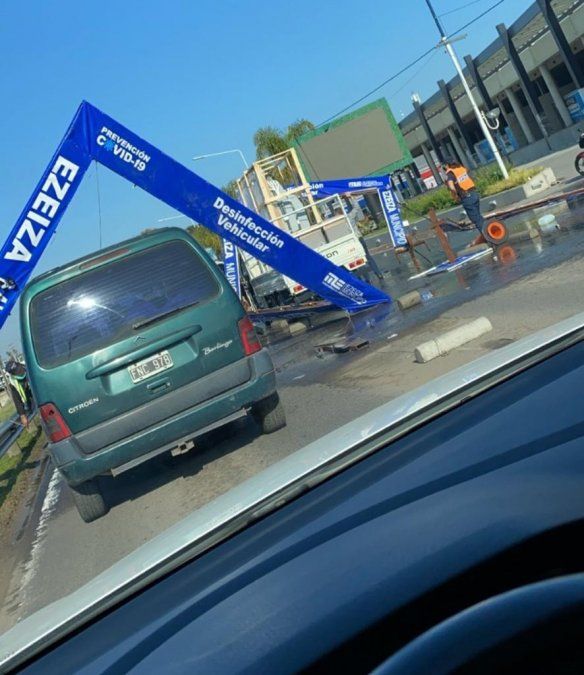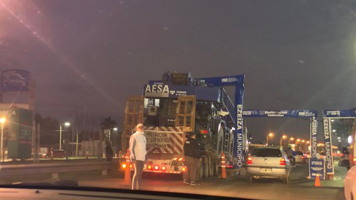 Si bien el Municipio de Ezeiza había colocado un nuevo arco para llevar a cabo la desinfección de los colectivos y camiones de gran porte, las dimensiones no alcanzaron y el camión quedó trabado en el medio del panel.
