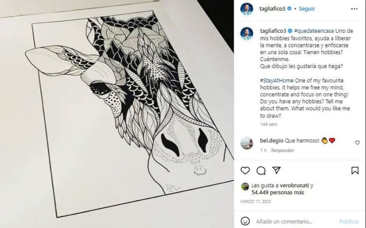 Rostros de personas y figuras de animales de una complejidad notable hacen de Tagliafico un artista con todas las letras. “Es uno de mis hobbies favoritos, ayuda a liberar la mente, a concentrarse y enfocarse en una sola cosa. ¿Tienen hobbies? Cuéntenme. ¿Qué dibujo les gustaría que haga?”, posteó en Instagram el futbolista en plena pandemia.