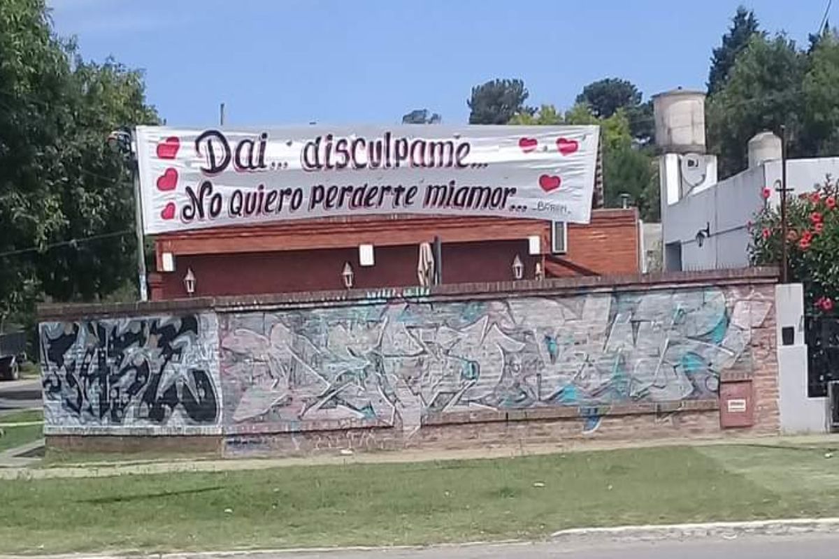 El pasacalles apareció colgado sobre la avenida Eva Perón en Guernica (ex 29), aparentemente en cercanías a la casa de la persona a la que está destinado, y dice: “Dai… discúlpame… no quiero perderte, mi amor.”. Para decorar el letrero de fondo blanco, al mensaje se le agregaron corazones.
