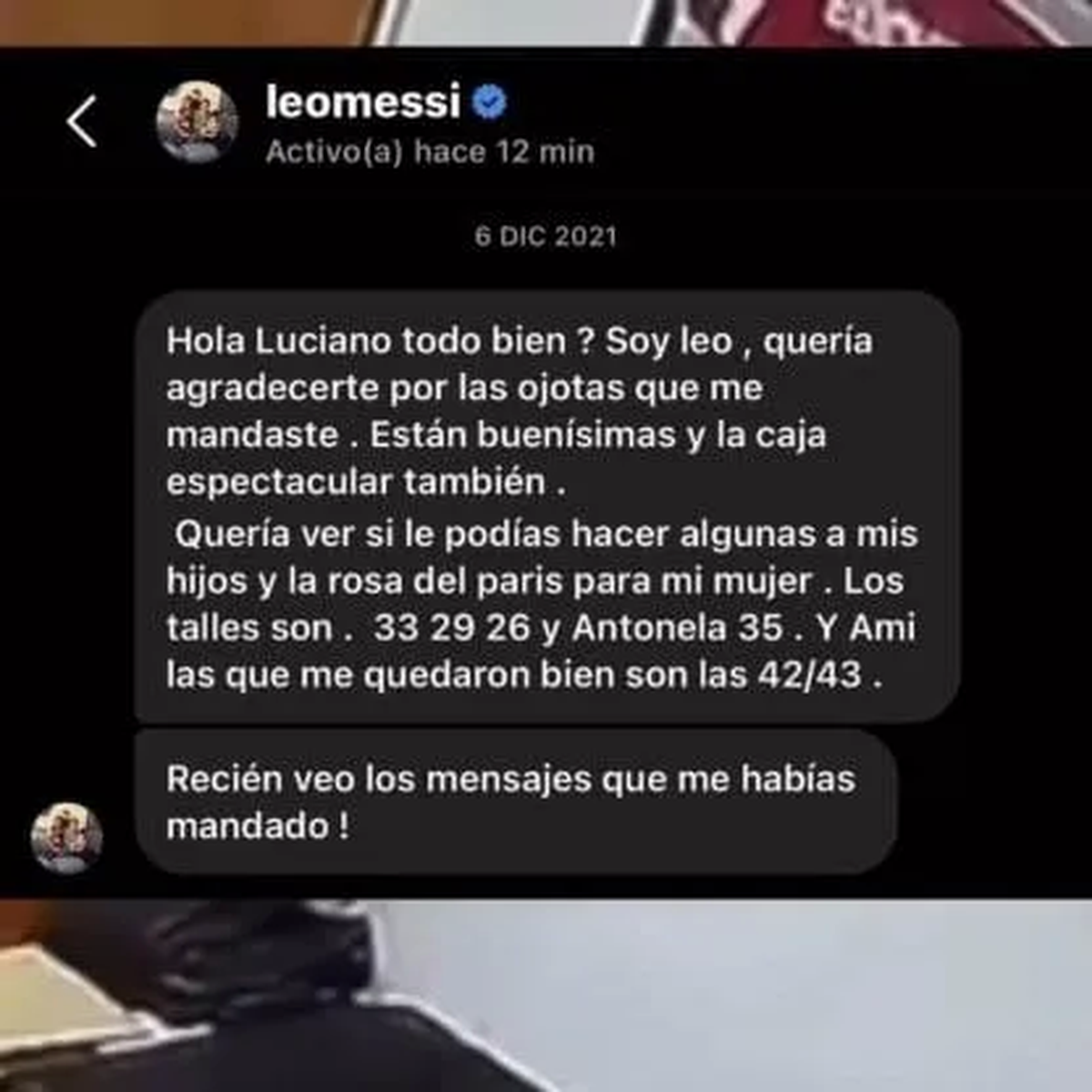 Ayer circuló en redes sociales la historia en la que Lionel Messi se presentaba para agradecer por unas ojotas y para pedir otros pares para Antonella Rocuzzo y sus hijos. "Hola, Luciano. Todo bien? Soy Leo", escribió el astro en Instagram.