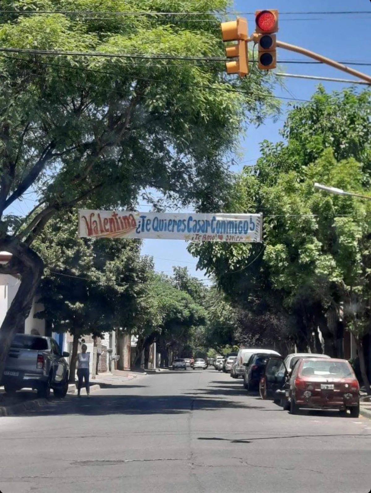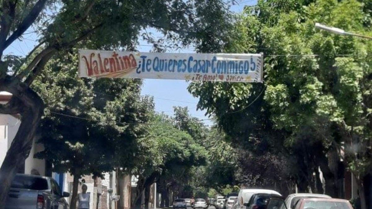 La declaración que se volvió viral fue compartida por la usuaria de Instagram, Caro Quiroga, que mientras recorría las calles del departamento de Godoy Cruz, se encontró con la propuesta de amor. "Valentina ¿te querés casar conmigo? Te amo, Javier" se podía leer en la inusual táctica para hacerle la pregunta más importante de la relación.