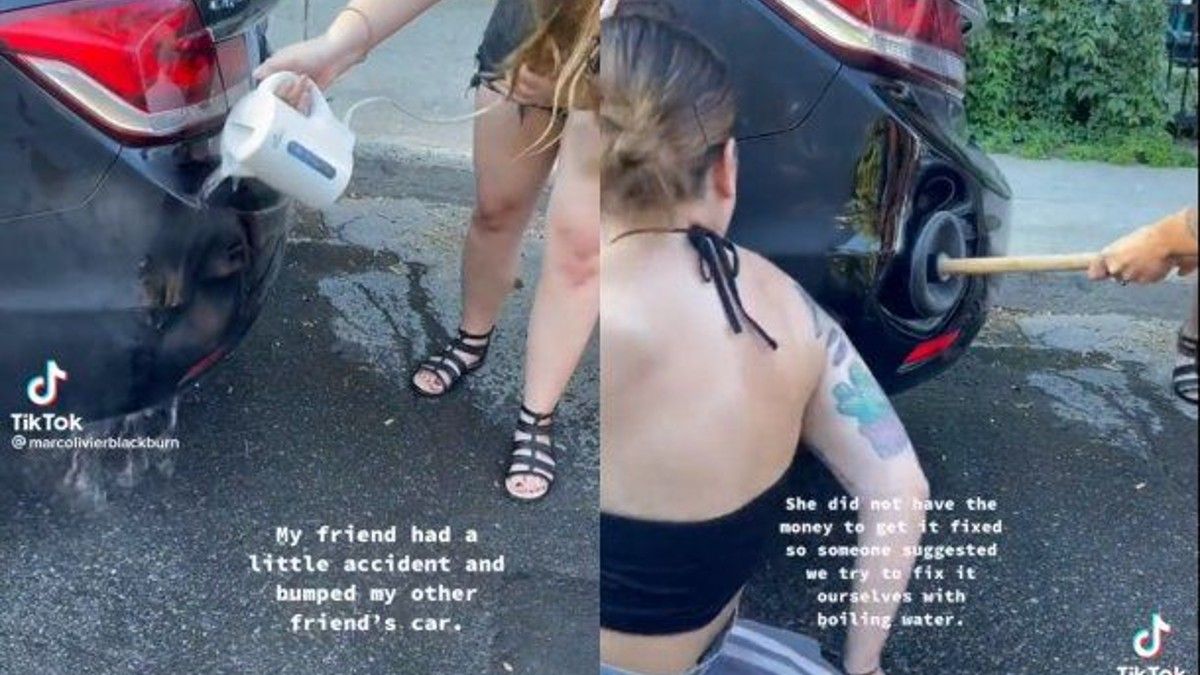 "Mi amiga tuvo un pequeño accidente y golpeó el auto de mi otra amiga", reza el mensaje del video de Tik Tok donde se ve a un grupo de jóvenes tirándole agua hirviendo al paragolpes abollado.
