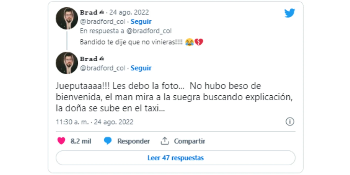 La ruptura que se hizo viral se iba a dar en Rionegro, también en Colombia. Todos los pasajeros del avión se subieron al vuelo y el usuario comentó el momento del aterrizaje. “No hubo beso de bienvenida, el man mira a la suegra buscando explicación, la doña se sube en el taxi...”, escribió Brad. Para culminar el hilo de tuits, el usuario de Twitter escribió, con humor: “Encendamos una velita por nuestro fallecido hermano Felipe”.