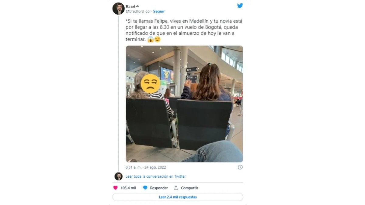“Si te llamas Felipe, vives en Medellín y tu novia está por llegar a las 8:30 en un vuelo de Bogotá, queda notificado de que en el almuerzo de hoy le van a terminar”, escribió el usuario @bradford_col junto con una fotografía de ambas mujeres.