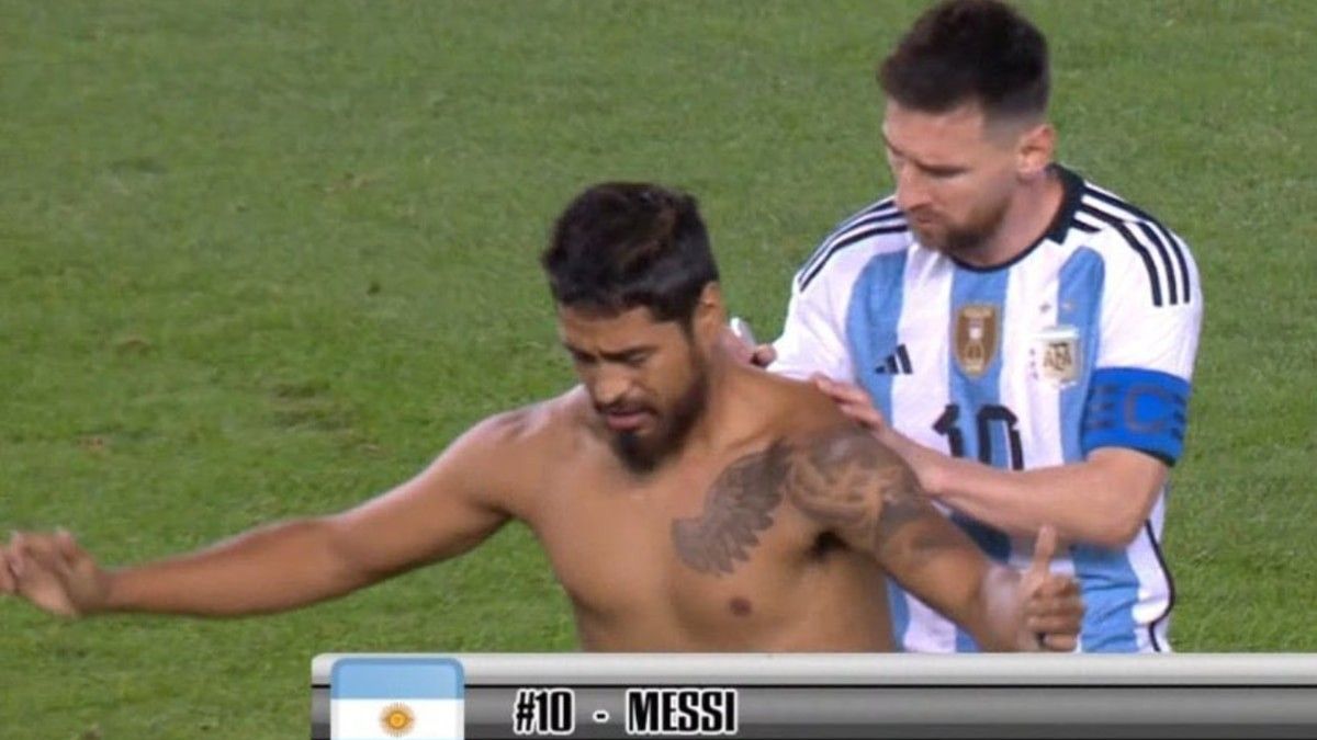 Con el torso descubierto y fibrón en mano, el cual le entregó a Leo para que el rosarino le estampe su firma en la espalda, el hombre estaba de rodillas en el verde césped cuando tres agentes de seguridad lo tacklearon y lo redujeron en el piso.